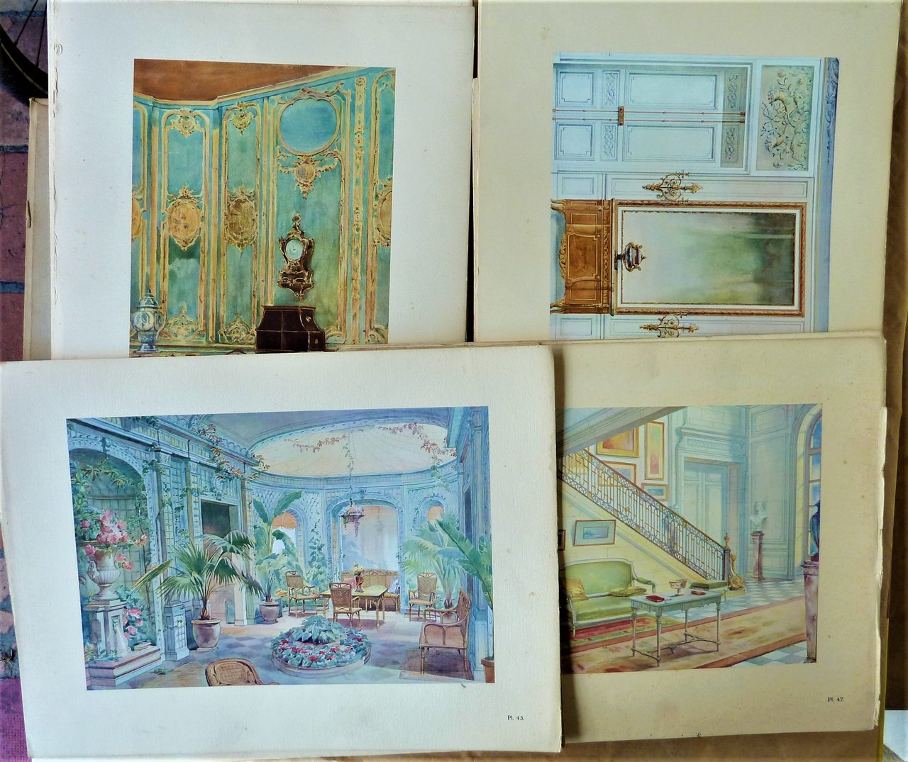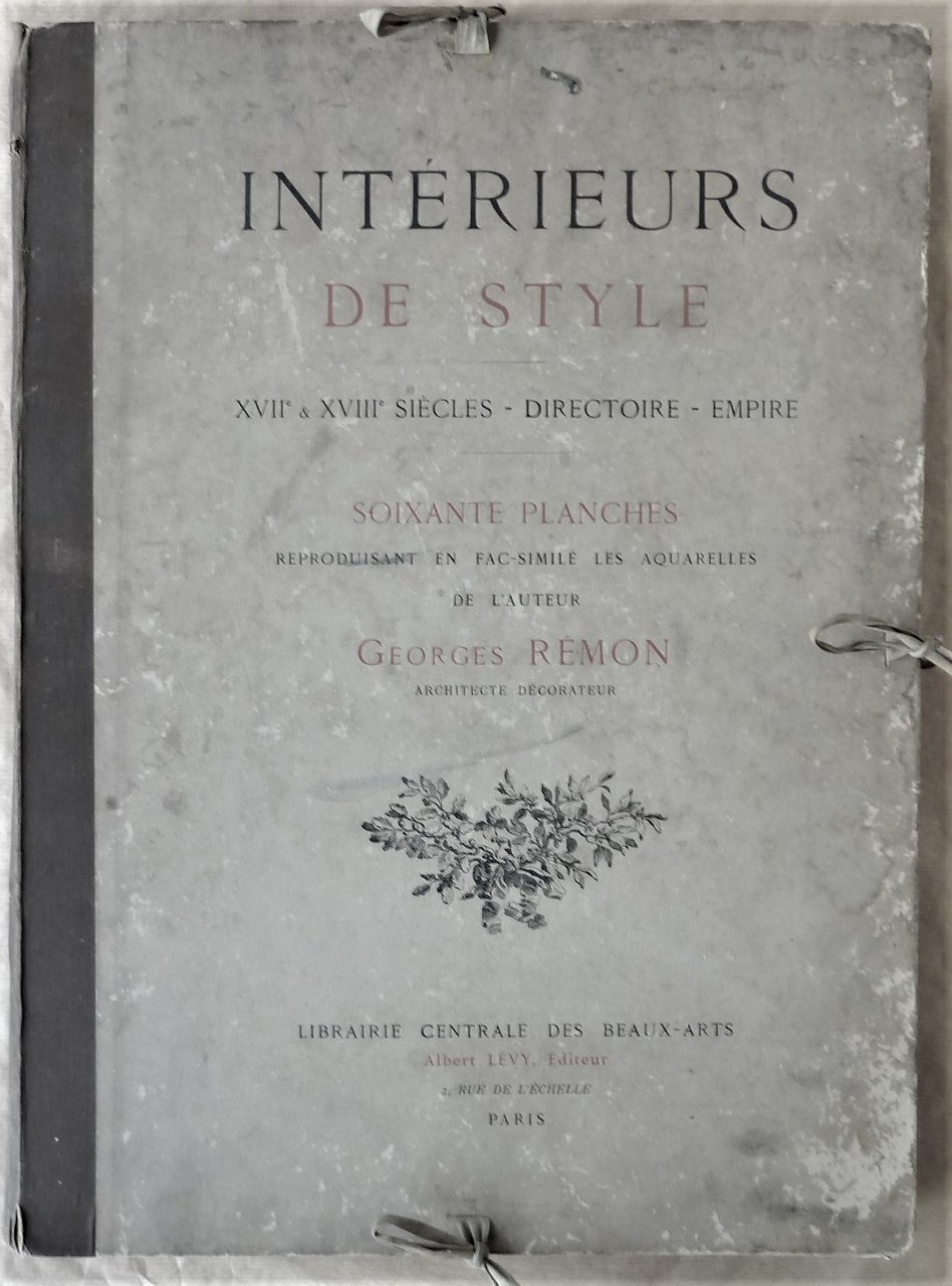 Un portefeuille de format grand in-folio, trois lacets, contenant 8 pp. de texte et 60 planches collées sur carton fort, en couleurs; reproduisant en fac-similé les aquarelles de l'auteur Georges Rémon architecte décorateur. Le portefeuille est fortement défraîchi mais solide; les planches sont en bel état Voir les photos. Un ouvrage de référence vraiment peu fréquent.