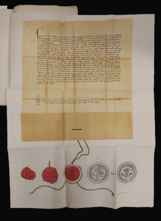 in-4, pp. 26, bella leg. bross. edit. con copertina e front. inc. a due colori. Con una tav. ripiegata al fine con l’albero genealogico della famiglia dei Carraresi, altra tav. ripiegata a colori riproducente una antico manoscritto con i sigilli. Pubblicazione per le nozze Papafava dei Carraresi - Cittadella.