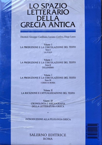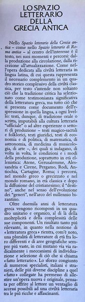 LO SPAZIO LETTERARIO DELLA GRECIA ANTICA Nello Spazio letterario della Grecia antica come nello Spazio letterario di Roma antica al centro dell'interesse è il testo, nei suoi momenti e percorsi: dalla produzione alla circolazione, dalla ricezione all'attualizzazione. Come nell'opera dedicata alla civiltà letteraria in lingua latina, di cui questa rappresenta il necessario complemento in un quadro storico complessivo della civiltà classica, per testo s'intende non soltanto ciò che la tradizione critica ha selezionato come testimonianza significativa della letteratura greca, ma tutto ciò che SI presenta come documento dell'espressione in quella lingua, a ogni livello: testi, dunque, di tradizione orale o scritta, imputabili alla cultura letteraria "ufficiale" o ad altre esperienze o settori di produzione testi magico-sacrali e folklorici, testi giuridici, testi di economia e di politica, di matematica, di astronomia, di medicina di musicologia, di arte -, dei quali si indagano, di volta in volta, le condizioni e i modi della produzione, soprattutto in età ellenistica: Atene, Gerusalemme, Alessandria e Cirene, Pergamo, Rodi, Antiochia, Cartagine, Roma, i percorsi, nel mondo greco o grecizzato e nel. mondo romano, in età classica e dopo la diffusione del cristianesimo; il "destino", anche nel senso dell'evoluzione dei "generi, nell'arco del millennio bizantino. Oltre duemila anni di letteratura greca vengono ricomposti in un quadro unitario e organico, al di là della molteplicità e della complessità delle sue componenti. Un risultato tanto più rilevante, in quanto nella nozione di «letteratura greca» rientra, com'è noto, una pluralità di letterature di età fra loro differenti e di aree geografiche sempre più vaste, in cui mutano via via radicalmente i meccanismi di individuazione e selezione di ciò che si chiama «fatto letterario». Lo sforzo congiunto di numerosi specialisti, italiani e stranieri, delle più diverse discipline a quel «fatto» collegate ha permesso di allestire un'opera nuova e originale, pensata per offrire al lettore un ventaglio di accessi possibili ad una civiltà letteraria tra le più ricche e affascinanti.