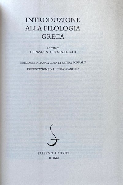 INTRODUZIONE ALLA FILOLOGIA GRECA. A CURA DI HEINZ-GÜNTHER NESSELRATH; EDIZIONE ITALIANA A CURA DI SOTERA FORNARO; PRESENTAZIONE DI LUCIANO CANFORA