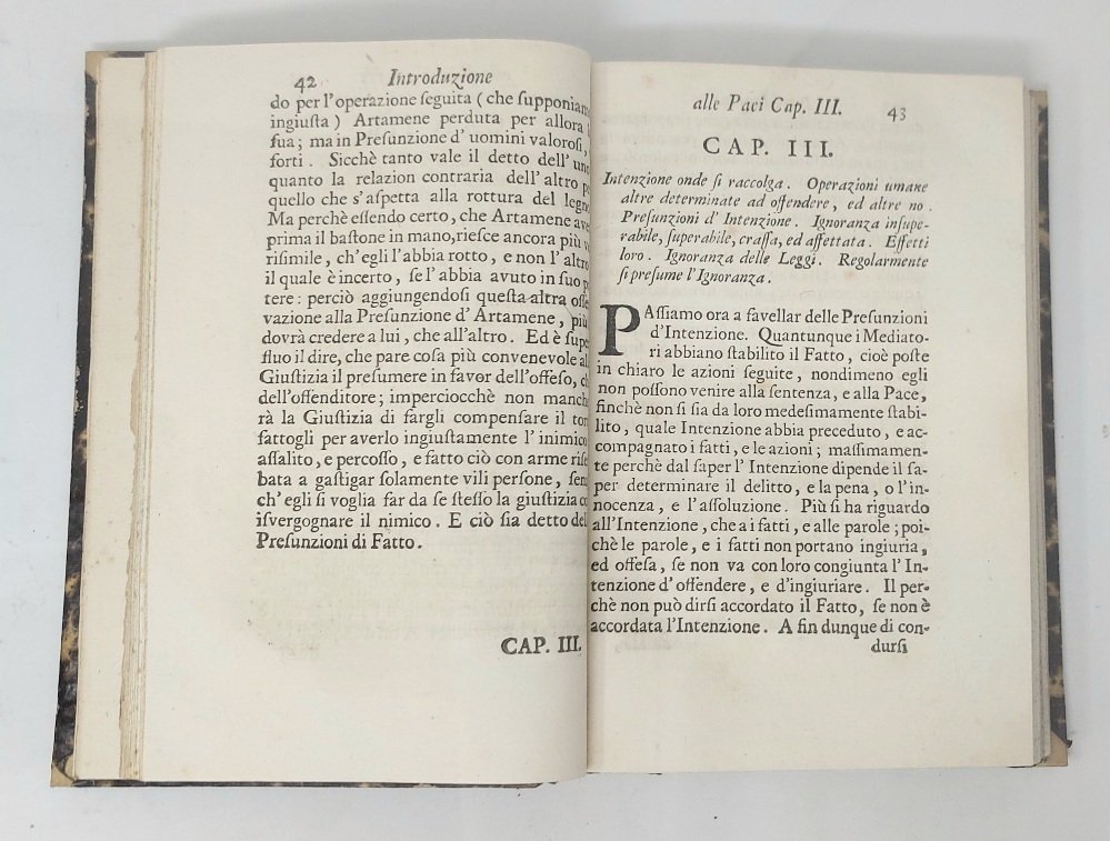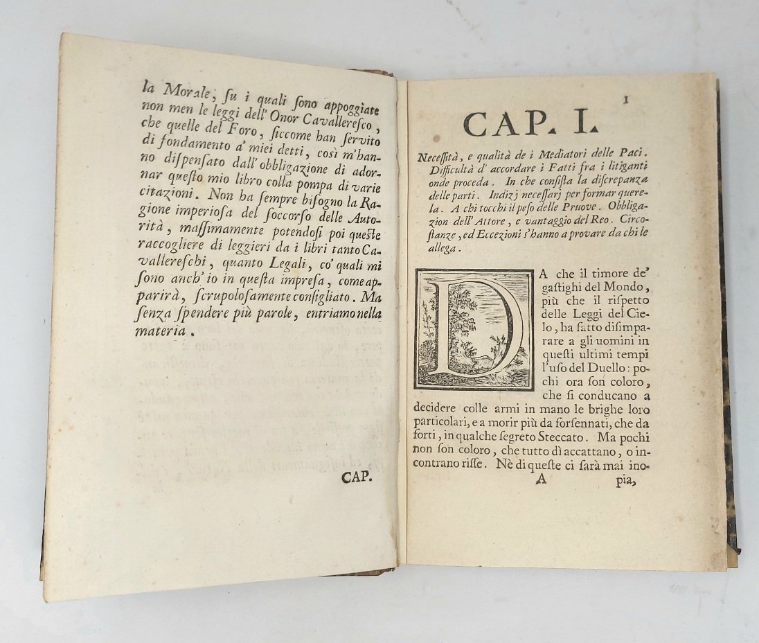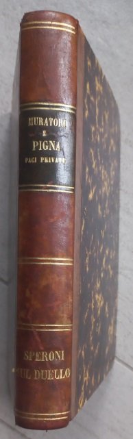 >In-8 p. (12), 287, (1). Occhietto, fregio xilografico al frontespizio, capilettera xilografici. Legatura in mezza pelle ottocentesca con filetti dorati e titolo su tassello al dorso. Prima edizione di tutte e tre le opere, di argomento filosofico-giuridico e cavalleresco, che trattano dei comportamenti nobiliari improntati al sistema dell'onore nella composizione delle liti private, con espedienti tra i quali, ancora nel primo '700, figurava il duello tra gentiluomini per dirimere le dispute. A testimonianza dell'attualità dell'argomento, Muratori non solo ne scrive, ma si fa punto di pubblicare due opere che per lungo tempo erano rimaste inedite; è infatti ben noto che a sollecitare la riflessione del modenese erano stati i molti casi di liti e contese, di duelli e di brighe, non solo nel Ducato, ma in varie parti d'Italia dove il duello era ancora largamente in uso. Buon esemplare di opera non comune (sporadiche e lievi arrossature).