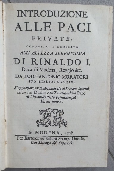 Introduzione alle paci private, composta, e dedicata all'altezza serenissima di Rinaldo I. Duca di Modena, Reggio &c. da Lod.co Antonio Muratori suo bibliotecario. S'aggiungono un Ragionamento di Sperone Speroni intorno al Duello, e un Trattato della Pace di Giovam-Batista Pigna non pubblicati finora.