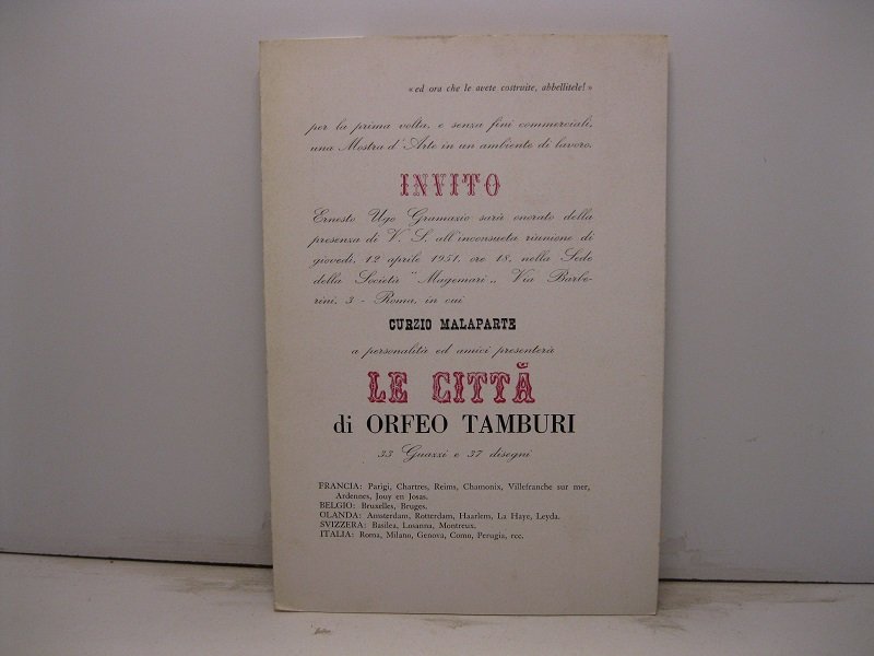 Invito. Ernesto Ugo Gramazio sara' onorato della presenza di V. S. all'inconsueta riunione di giovedi', 12 aprile 1951, ore 18, nella sede della Societa' 'Magemari'. in cui Curzio Malaparte a personalita' ed amici presentera' Le citta' di Orfeo Tamburi 33 guazzi 37 disegni