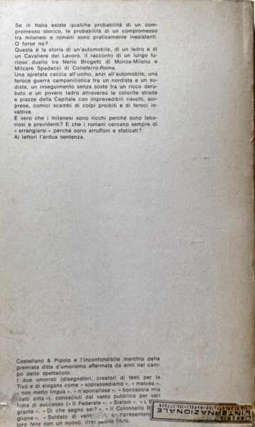 Se in Italia esiste qualche probabilità di un compromesso storico, le probabilità di un compromesso tra milanesi e romani sono praticamente inesistenti. O no? Questa è la storia di un'automobile, di un ladro e di un Cavaliere del Lavoro, il racconto di un lungo furioso duello tra Nerio Brogetti di Monza-Milano e Milcare Spadacci di Colleferro-Roma. Una spietata caccia all'uomo, anzi all'automobile, una feroce guerra campanilistica tra un nordista e un sudista, un inseguimento senza soste tra un ricco derubato e un povero ladro attraverso le colorite strade e piazze della Capitale con imprevedibili risvolti, sorprese, comici scambi di colpi proibiti e di feroci invettive. È vero che i milanesi sono ricchi perché sono laboriosi e previdenti? E che i romani cercano sempre di arrangiarsi perché sono arruffoni e sfaticati? A i lettori l'ardua sentenza.