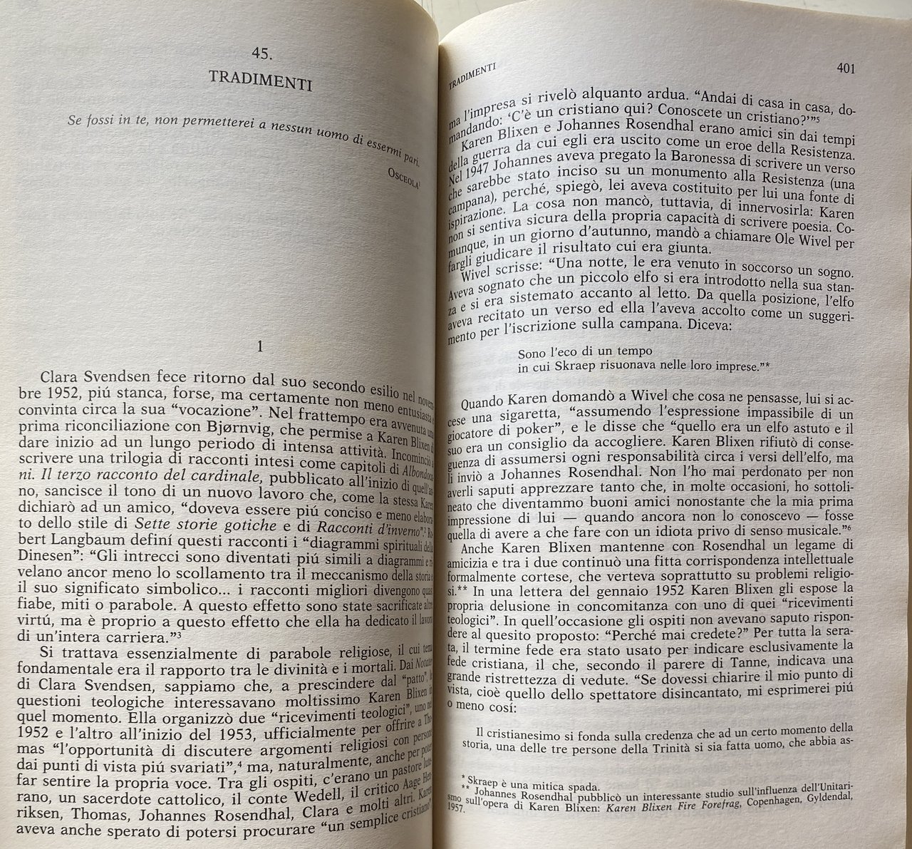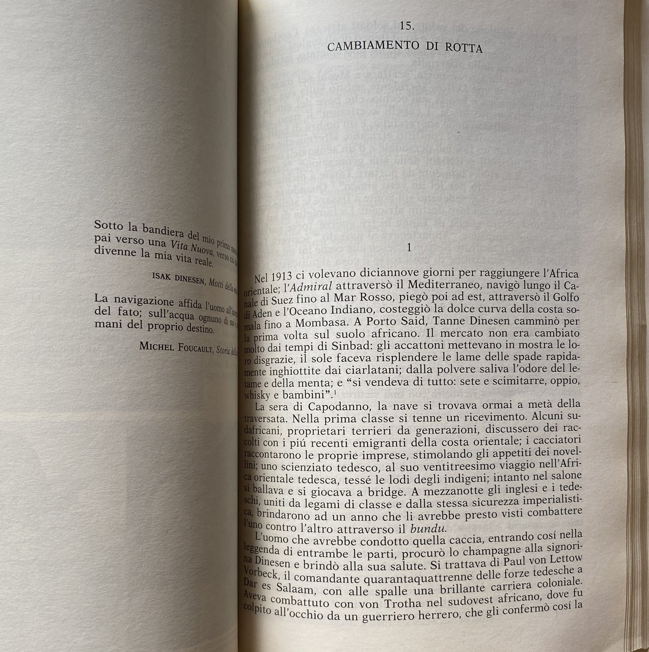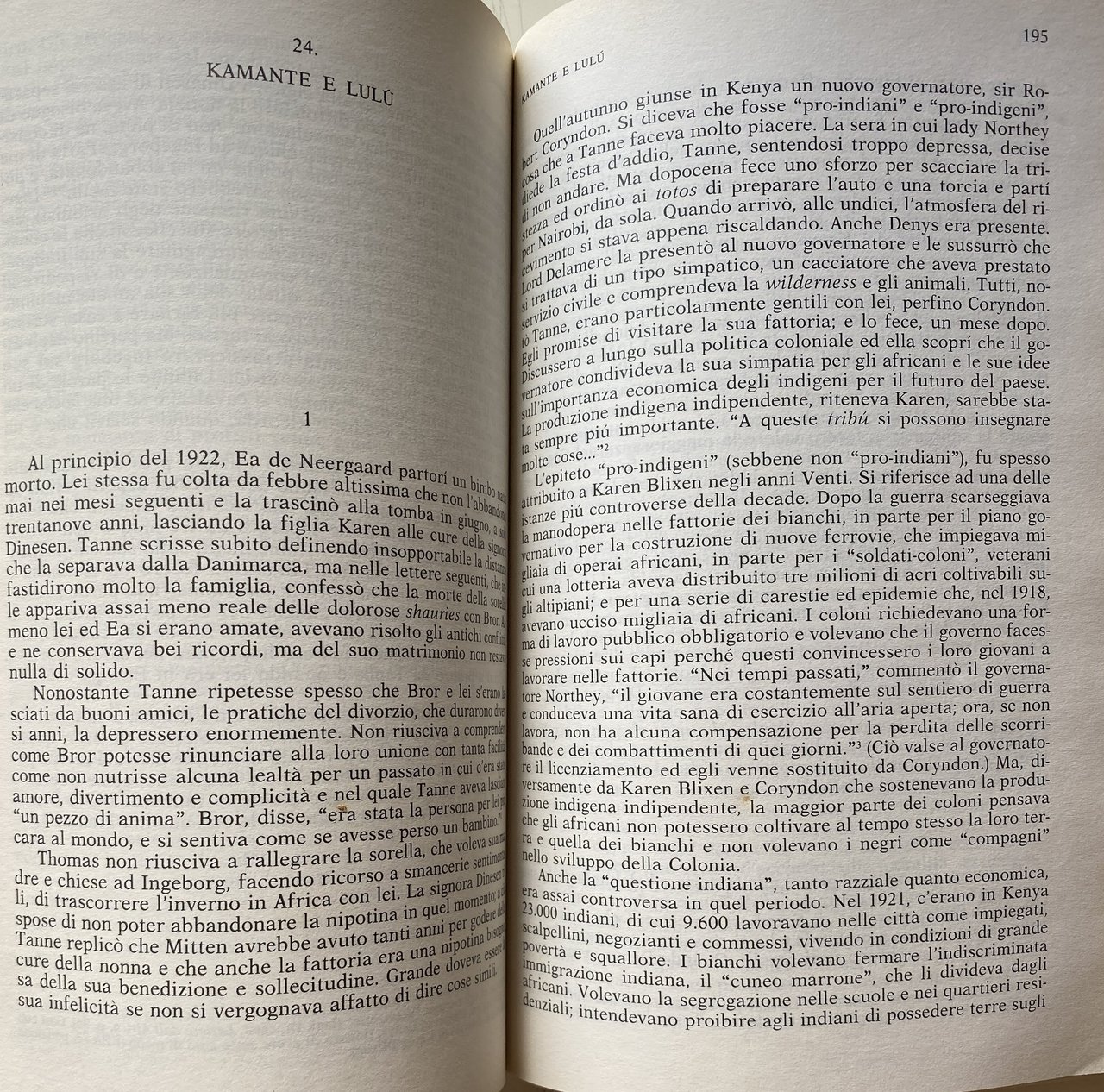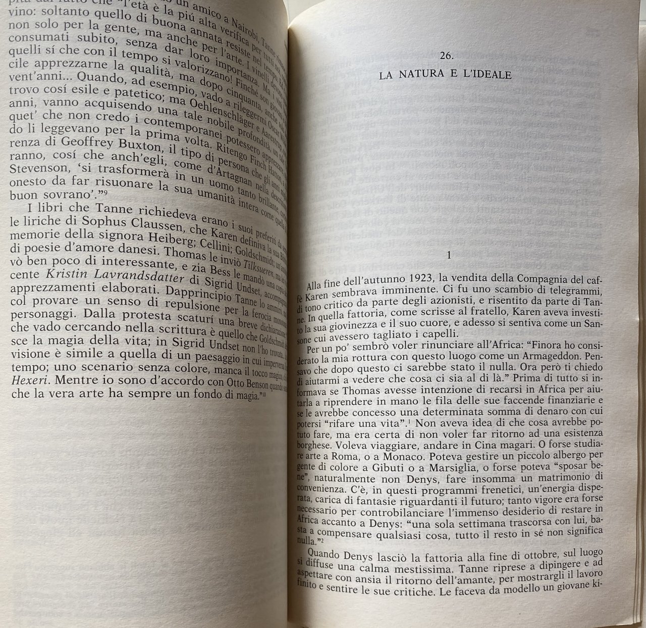 Soggetti: Biografie Memorie Biografia Vita Storie vere Letteratura Romanzi storici Opere Archivio Manoscritti Corrispondenza Carte personali KBA Lettere Taccuini Infanzia Dattiloscritti Recensioni Articoli Interviste Disegni Diario Discorsi Familiari Miscellanea Robert Haas Random House SGT Seven Gothic Tales OA Out of Africa WT Winter's Tales LT Last Tales AD Anecdotes of Destiny SG Shadows on the Grass Sette storie gotiche La mia Africa Racconti d'inverno Ultimi racconti Capricci del destino Ombre sull'erba Clara Svendsen Copenhagen Suicidio Padre Matrimonio Barone Bror von Blixen Gemello Hans Piantagione di caffè Kanyan Bancarotta Divorzio Danimarca Sifilide Rungstedlund Karen Christentze Dinesen Baronessa von Blixen-Finecke Osceola Scrittrici Amore Fattoria Parigi Kenya Nairobi Ricordi africani Fotografie Denys Finch Hatton Sydney Pollack Scrittori danesi XX secolo Ottocento Novecento Racconti Nairobi Nostalgia Tormento Sconfitta Bellezza Libertà Leoni Croce del Sud Grandi praterie Somali Kikuyu Masai Ngong Hills Freja Natura Savana Safari Avventura Tradimenti Bibliografia Riferimento Prime edizioni Collezionismo Thorkild Bjørnvig Heretica Fratello Langbaum Lindström Cena Mombasa Zia Bess Nietzsche Ole Wivel Pagten Parmenia Migel Poesia Sogni Morte Inglese Erling Schroeder Famiglia Farah Folehave Relazione Conversazione Syv fantastiske Fortællinger Indigeni Indiani Africani Wilderness Colonialismo Imperialismo Coloni Carestie Epidemie Razzismo Bianchi Neri Tribù Colonie Coltivazioni Borghesia Nobili Lavoro Tanne Anne Born Joan Tate Viaggio America Hannah Arendt Liselotte Henriksen Walter Benjamin Georg Brandes Truman Capot Wilhelm Dinesen Ernest Hemingway Frans Lasson Kierkegaard Propp Donne Genere Vita Biographies Memoirs Biography Life True stories Literature Historical novels Works Archive Manuscripts Correspondence Personal papers Letters Notebooks Childhood Typescripts Reviews Articles Interviews Drawings Diary Family speeches Miscellaneous My Africa Winter stories Last stories Whims of fate Shadows on the grass Suicide Father Marriage Baron Twin Coffee plantation Bankruptcy Divorce Denmark Syphilis Baroness Women writers Love Farm Paris African memories Photographs Danish writers 20th century 19th century 20th century Stories Torment Defeat Beauty Freedom Lions Southern Cross Great prairies Somalis Nature Savannah Adventure Betrayals Bibliography Reference First editions Collectibles Vintage Brother Dinner Poetry Dreams Death English Family Relationship Conversation Indigenous people Indians Africans Colonialism Imperialism Colonists Famine Epidemics Racism Whites Blacks Tribes Colonies Crops Bourgeoisie Nobles Work Travel Women Gender Life