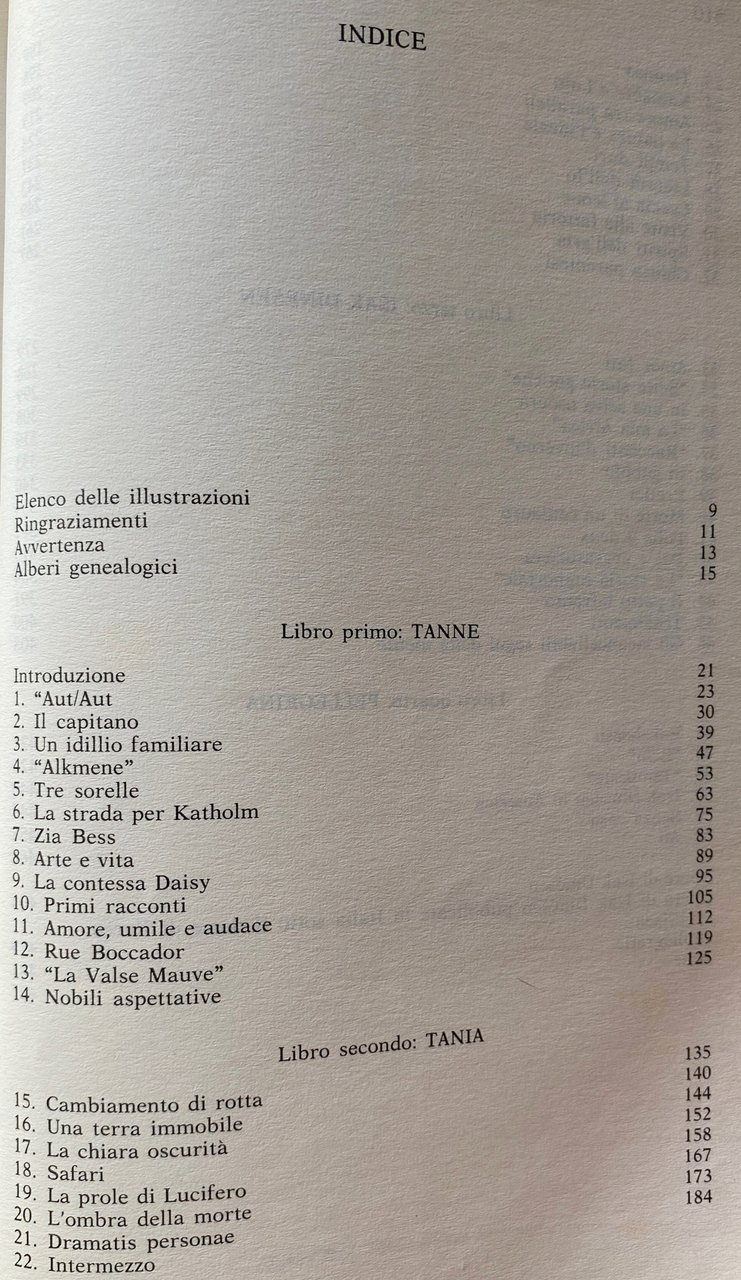 - Biografie, Memorie, Biografia, Vita, Storie vere, Letteratura, Romanzi storici, Romanzi biografici, Romanzi gotici, Romanzo gotico, Donne, Opere generali, Manoscritti, Corrispondenza, Lettere, Taccuini, Interviste, Disegni, Diari, Miscellanea, Sette storie gotiche, La mia Africa, Racconti d'inverno, Libri illustrati, Colonialismo Africa, Amore, Relazioni, Tradimenti, Racconti, Scrittrici, Ottocento, Novecento, Letteratura danese