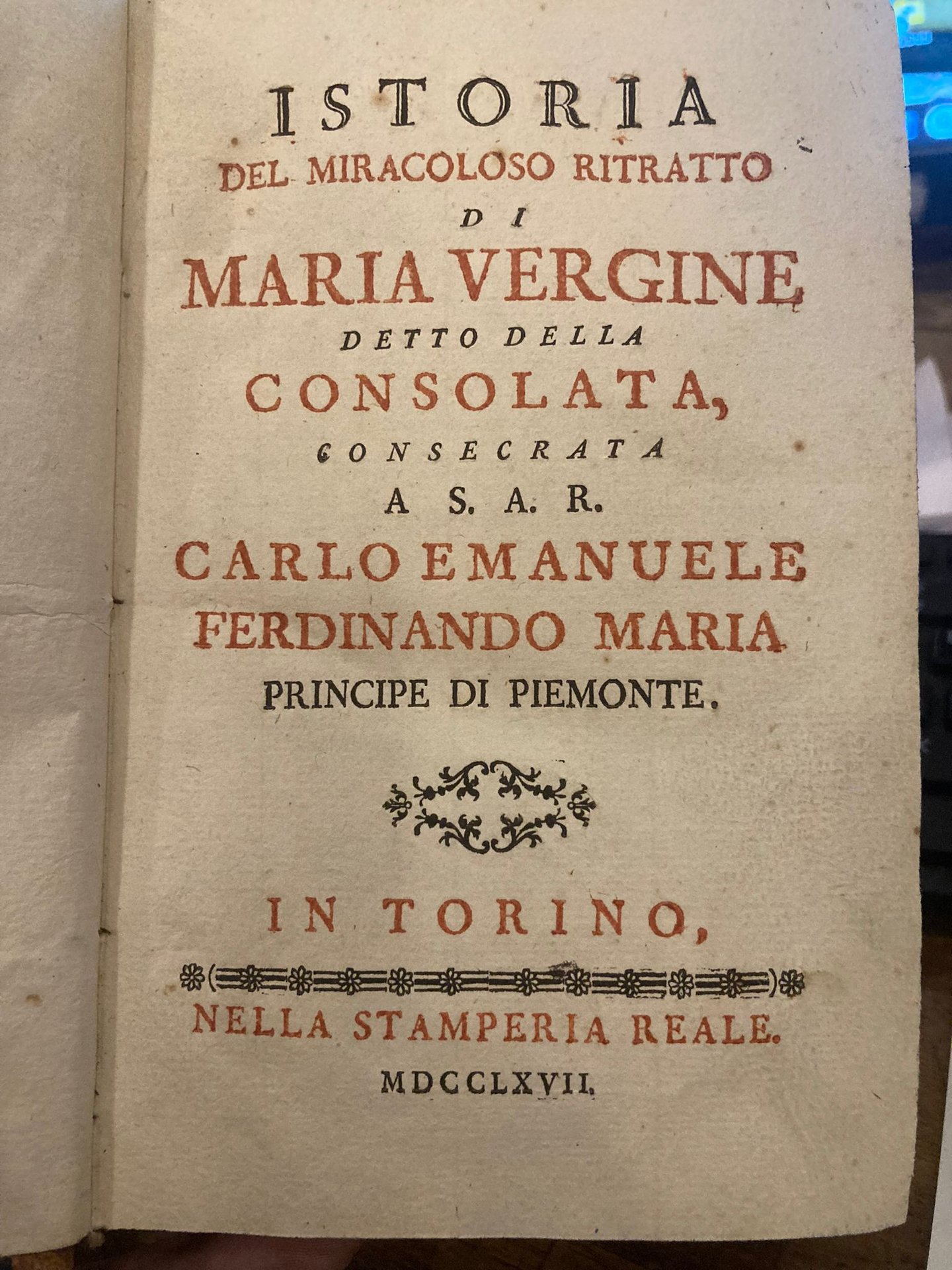 Istoria del miracoloso ritratto di Maria Vergine detto della Consolata consecrata a S.A.R. Carlo Emanuele Ferdinando Maria principe di Piemonte | Libros antiguos y modernos |
