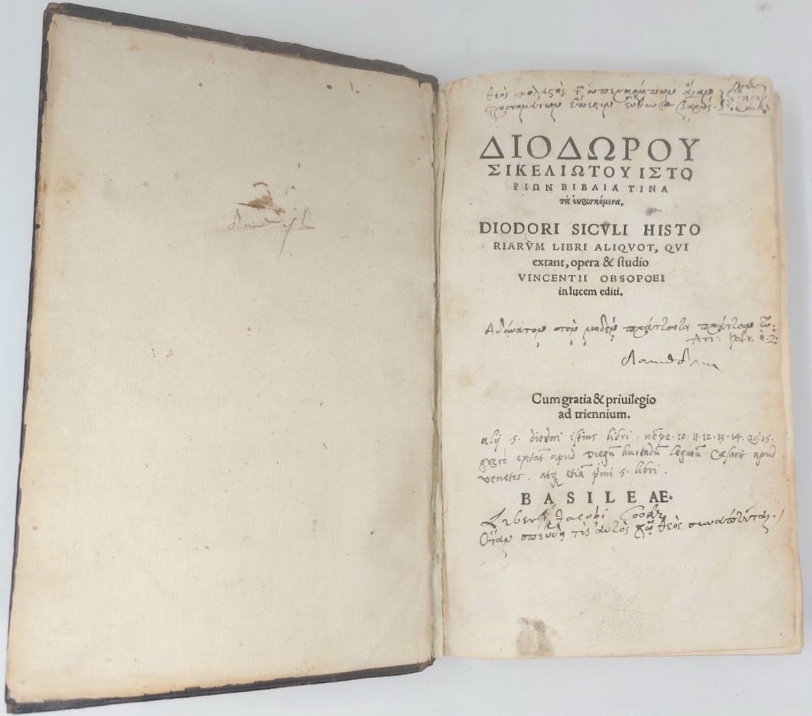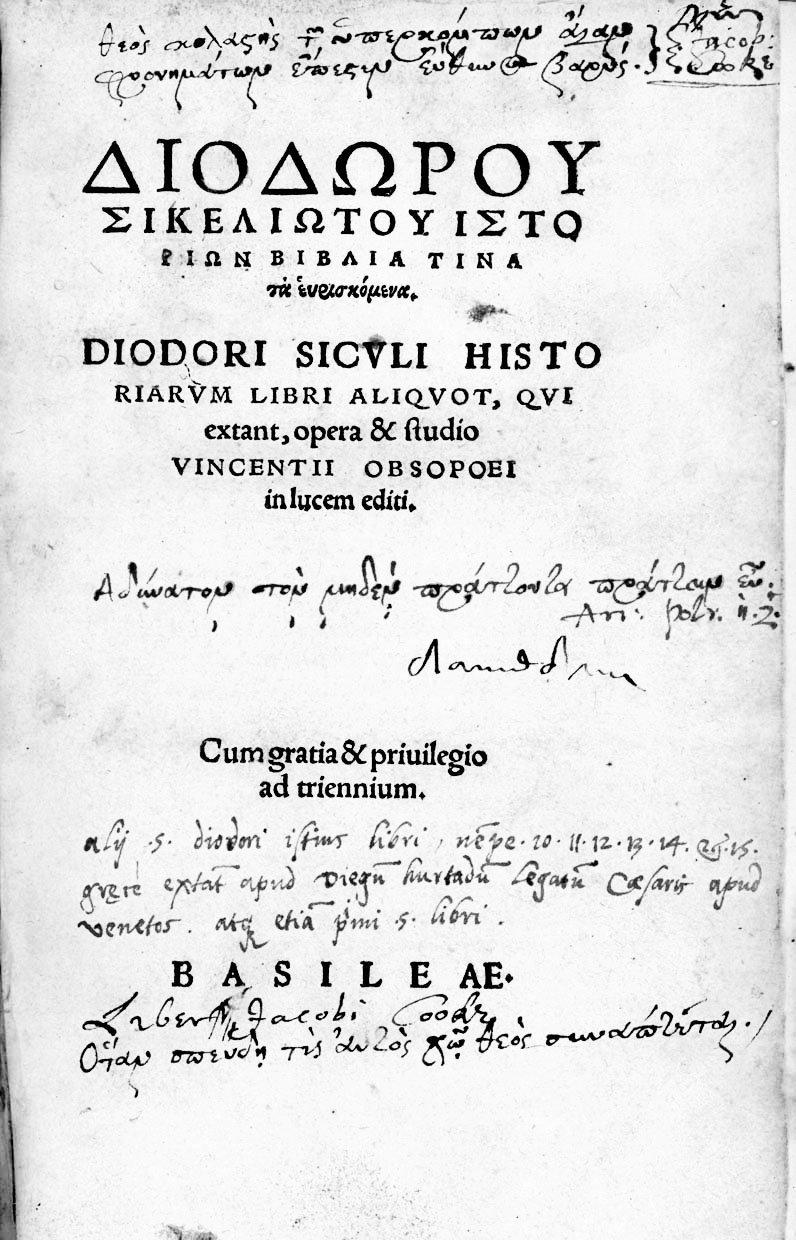 Istorion Biblia tina ta heuriskomena (in greco). Diodori Siculi Historiarum Libri aliquot, qui extant, opera & studio Vincentii Obsopoei in lucem editi.