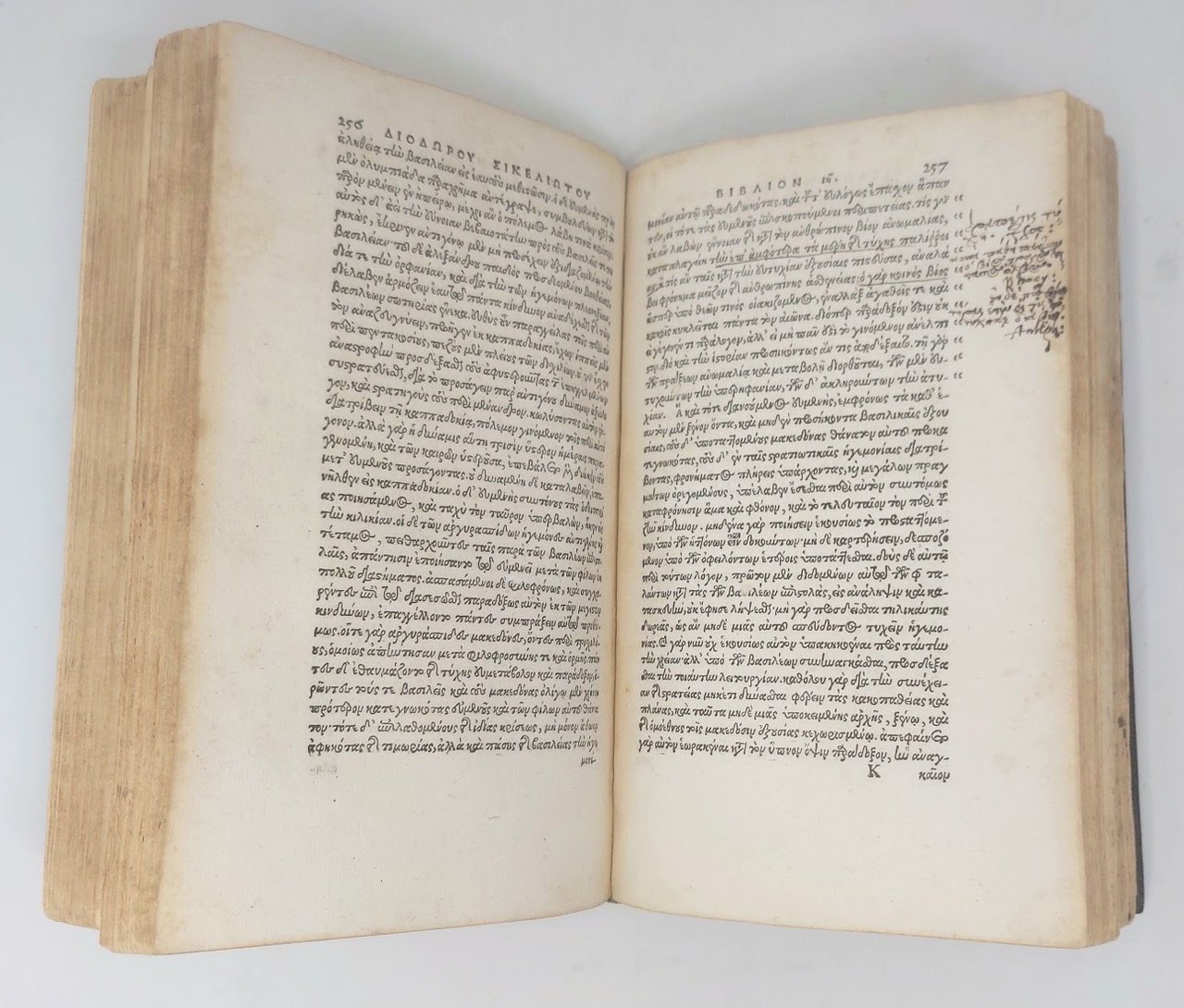 >in-4 (215x130 mm), pp. (12), 481, (3), legatura coeva in p. pelle su assicelle, cornice con impressioni vegetali a secco sui piatti, dorso rifatto con applicato dorso originale, tassello tardo parzialmente conservato. Belle iniziali istoriate; testo interamente in greco (parte del titolo e dedica dell'editore in latino). Edizione originale dei libri 16-20 della Biblioteca Storica di Diodoro Siculo (80-20 a.C. ca.), una storia universale in 40 libri dalle origini mitiche alla spedizione di Cesare in Gallia. Dell'opera rimangono i libri I-V e XI-XX, e degli altri libri solo estratti e riassunti (spesso molto ampi), dovuti alla grande circolazione e notorietà della Biblioteca nel Tardo Antico. L'edizione, curata da Vincentius Obsopoeus, comprende il libro XVI dedicato a Filippo II, il XVII ad Alessandro e parte della storia ellenistica che occupa i libri XVIII-XXII. Ottimo esemplare (numerose postille marginali in greco e nota di possesso: Jacobus Cooke). STC German D-243. Dibdin I, 495.