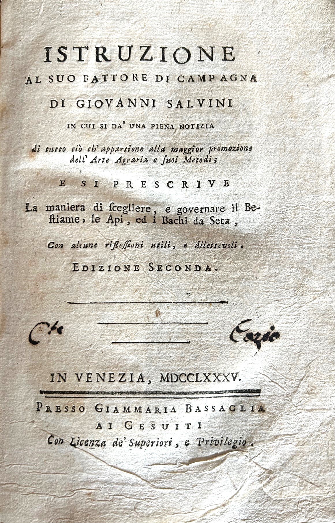 Istruzione al suo fattore di campagna in cui si da una piena notizia di tutto ciò che appartiene alla maggior promozione dell'Arte Agraria e suoi Metodi; e si prescrive la maniera di scegliere e governare il Bestiame, le Api, ed i Bachi da Seta...