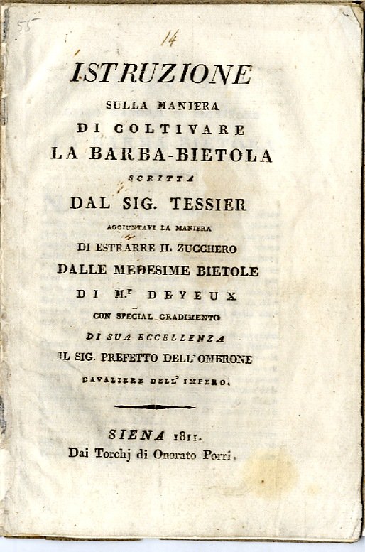 >In-8, pp. 20, brochure originale muta. Raro opuscolo divulgativo atto a rendere nota la coltivazione di questa radice che durante il periodo napoleonico venne utilizzata per l'estrazione dello zucchero, al fine di contrastare il monopolio inglese dello zucchero di canna. Buon esemplare.