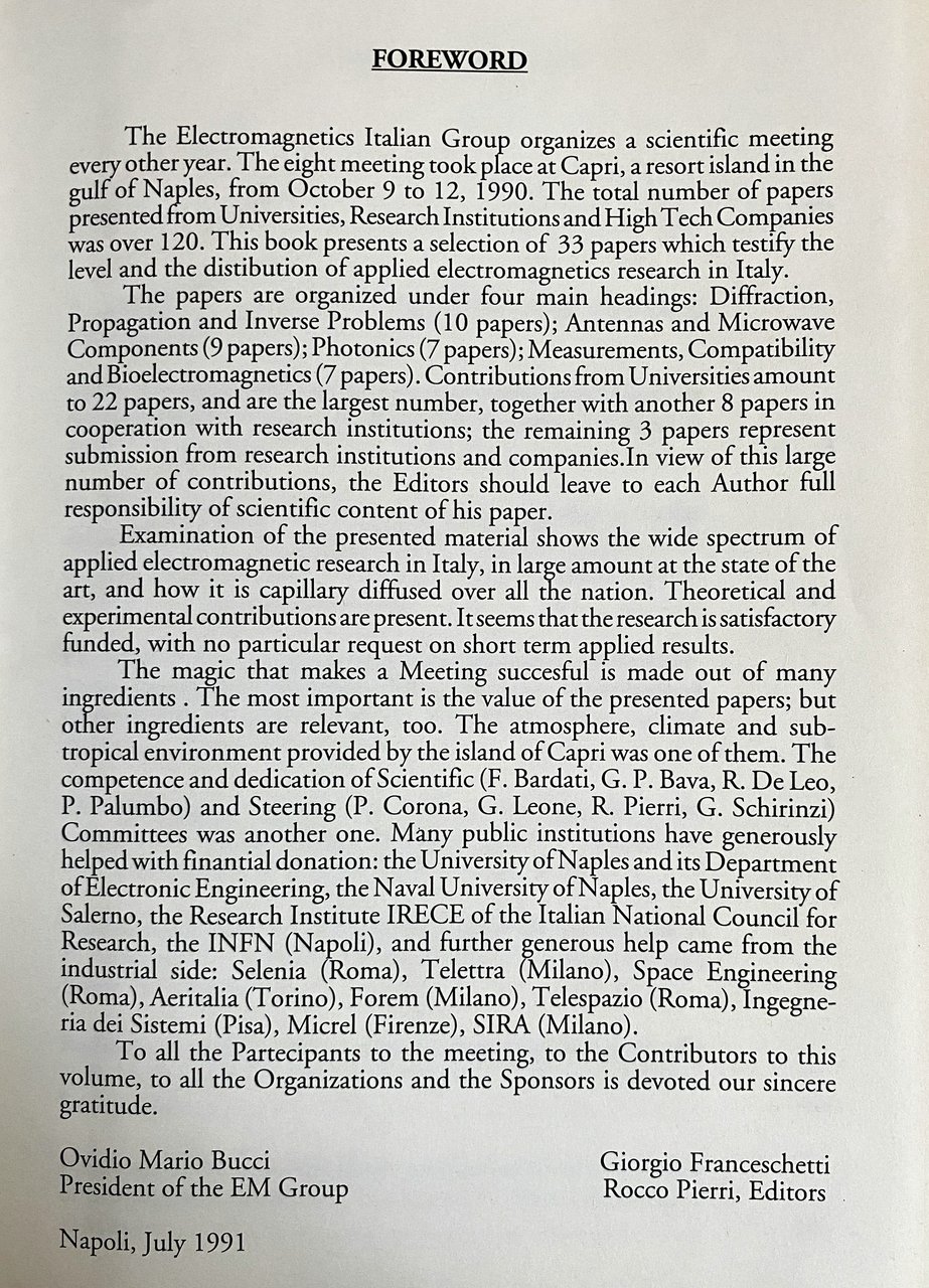 The magic that makes a Meeting succesful is made out of many ingredients. The most important is the value of the presented papers; but other ingredients are relevant, too. The atmosphere, climate and sub-tropical environment provided by the island of Capri was one of them. The competence and dedication of Scientific (F. Bardati, G. P. Bava, R. De Leo, P. Palumbo) and Steering (P. Corona, G. Leone, R. Pierri, G. Schirinzi) Committees was another one. Many public institutions have generously helped with finantial donation: the University of Naples and its Department of Electronic Engineering, the Naval University of Naples, the University of Salerno, the Research Institute IRECE of the Italian National Council for Research, the INFN (Napoli), and further generous help came from the industrial side: Selenia (Roma), Telettra (Milano), Space Engineering (Roma), Aeritalia (Torino), Forem (Milano), Telespazio (Roma), Ingegne-ria dei Sistemi (Pisa), Micrel (Firenze), SIRA (Milano).
