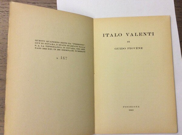 In-8 p., brossura orig. figurata, pp. 23, con 3 disegni a piena pag. nel testo e 8 tavole in bianco e nero fuori testo: vi sono riprodotte le opere del pittore Italo Valenti (1912-1995) che apparteneva al movimento di "Corrente". Tiratura di soli 200 esemplari numerati. Il ns., 167, è ben conservato.