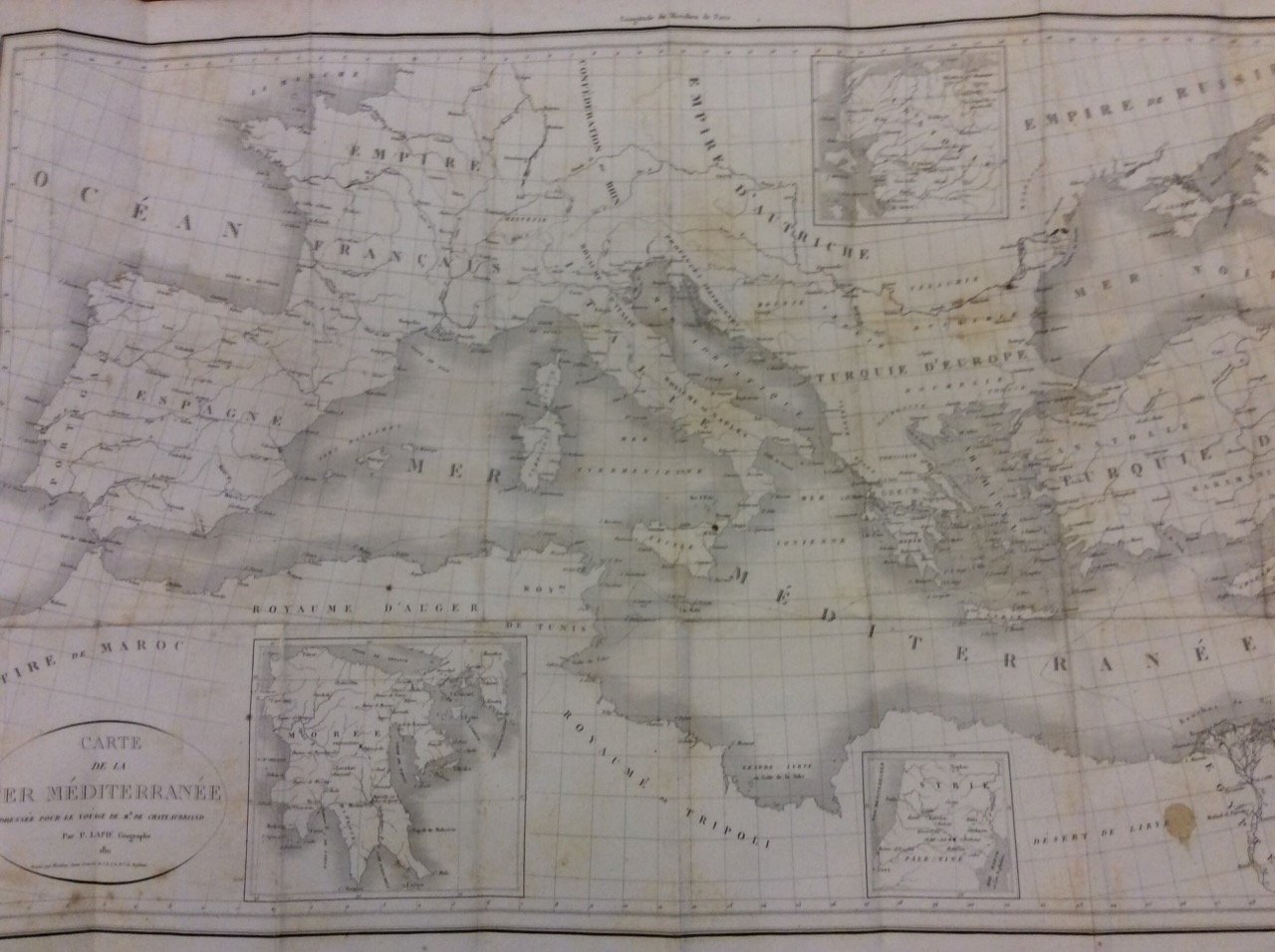 In-8 p. (mm. 202x124), 3 volumi, cartoncino coevo, tit. su etichetta al dorso, pp. CIX,277; (4),413; (4),370,8; con una bella e grande carta geografica del Mar Mediterraneo dressée pour le voyage de Mr. de Chateaubriand e un facsimile del contratto in arabo fatto tra Chateaubriand e il proprietario della barca che lo portò da Jaffa a Saint-Jean-d'Acre. "Prima edizione".Cfr. Gay Bibl. des ouvrages relatifs a l'Afrique et a l'Arabie,336: Ouvrage réimprimé souvent depuis. François-Auguste-René de Chateaubriand (1768-1848), scrittore francese. Di nobile famiglia, iniziò giovanissimo la carriera militare, interrotta dalla Rivoluzione; compì un viaggio in America; combatté nell'esercito degli emigrati, poi andò esule, sino al 1800, in Inghilterra, dove pubblicò l'Essai historique sur les révolutions.. Mirando a un'arte cristiana che reggesse il confronto con la bellezza classica, scrisse poi un ampio poema in prosa, "Les Martyrs" (1809), servendosi di elementi raccolti durante un viaggio in Oriente ("itineraire de Paris a Jerusalem", 1811).. Il suo esempio non fu estraneo alla formazione artistica di Flaubert, così Diz. Treccani,III, pp. 131-132.Rare e lievi fioriture, altrimenti esemplare ben conservato.