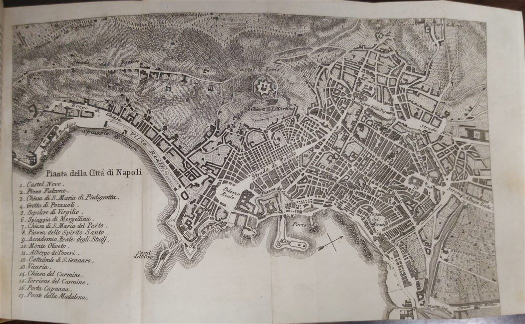in-16, pp. X, (2), 264, rileg. mod. m. pelle con tass. e tit. oro al d., piatti in cart. marmorizz. Tagli color. Con una gr. carta topogr., più volte rip. e in. in rame, raffigurante il viaggio da Roma a Napoli. Altra tav. inc rame rip. con la pianta di Napoli e 32 belle vedute in rame f.t. Splendido esempl. di celebre opera che descrive la storia e le bellezze artistiche della città di Napoli e suoi dintorni. Terza ediz. accresciuta nel numero delle tavv. Manca a Lozzi e Fossati Bellani che citano altre ediz. Fera II p.351: “Rara ed artistica guida otocentesca”. Manca a Rossetti. Ex libris Feltrinelli. [093]