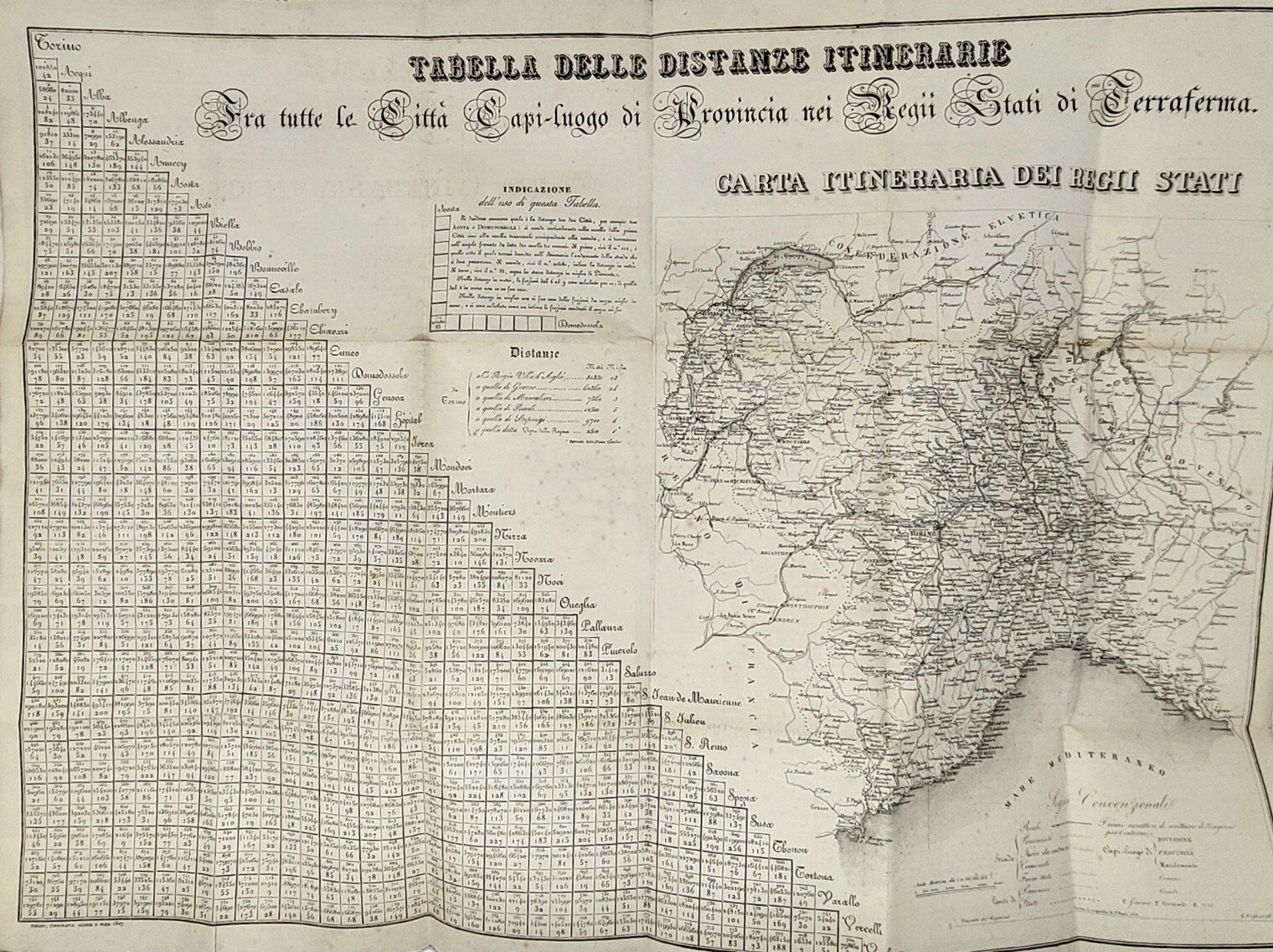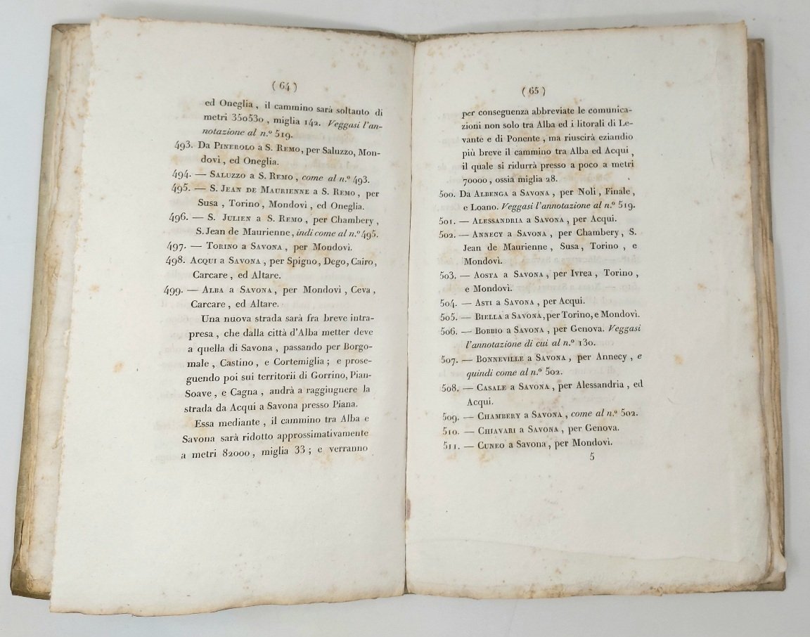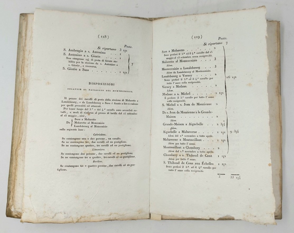 >in-8, pp. (8), 136 (le pagine 103-104 sono erroneamente poste tra le pp. 120-121), 1 grande carta geografica ripiegata in fine, legatura coeva in p. pergamena. Prima edizione, rara a trovarsi, specie completa della carta geografica in fine. L'opera è utilissima e assai interessante, comprende: la descrizione delle strade e l'indicazione delle vie in cui erano stabilite le stazioni postali, la tavola alfabetica delle strade postali, la disciplina del servizio postale, anche relativamente agli stati esteri, cenni sulle diligenze, sulle vetture privilegiate in corso regolare di posta, ed i prezzi per il trasporto di merci e persone dalla capitale ai capoluoghi di provincia. Infine si trovano le tavole di ragguaglio del ''miglio di Piemonte'' con le altre unità di misura italiane ed estere. Buon esemplare, in barbe e a pieni margini, lievi e sporadiche arrossature. Non in Manno-Promis.