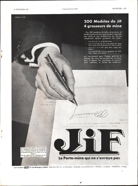 Jif le porte-mine qui ne s'enraye pas. Advertising 1932