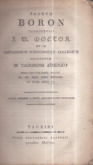 Joseph Boron taurinensis J. Doctor ut in amplissimum Jurisconsult. Collegium cooptetur in Taurinensi Athenaeo hora VIII cum dimid, matut. IV id. Maii anno MDCCCIII 22 Flor. anno II