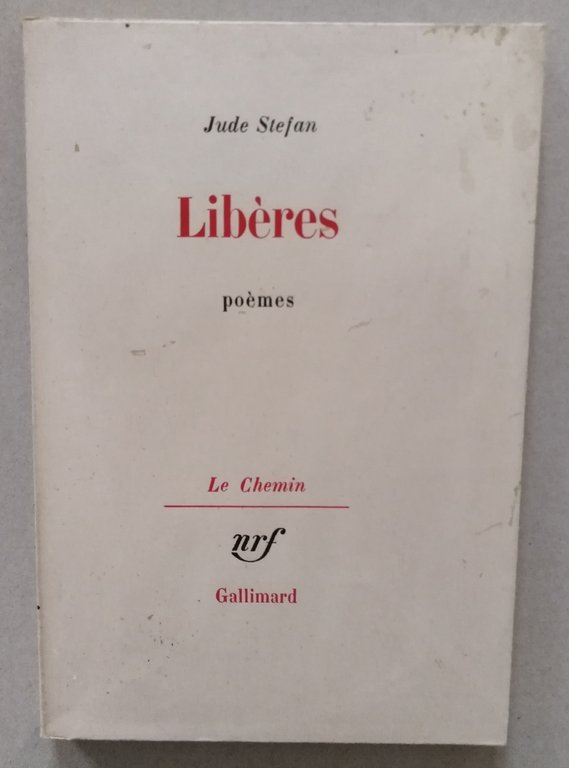 Jude Stefan, Libères poèmes Le Chemin, Editions Gallimard, 1970; cm. 20.5x14, pp. 104; br. ed., prima ed., testi in lingua francese, ed. numerata n/s 1574. Condizioni di conservazione Esemplare in buono stato con leggere tracce d'uso; brossura editoriale con minime macchiette. SETT144.L14319 MT