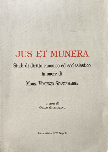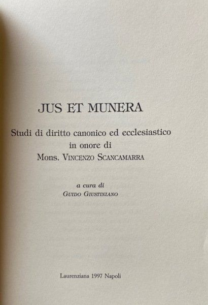 JUS ET MUNERA. STUDI DI DIRITTO CANONICO ED ECCLESIASTICO IN ONORE DI MONS. VINCENZO SCANCAMARRA. A CURA DI GUIDO GIUSTINIANO