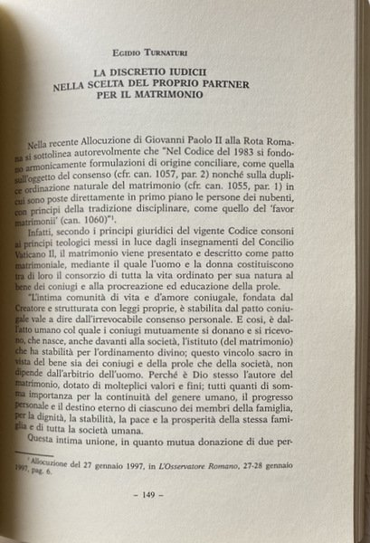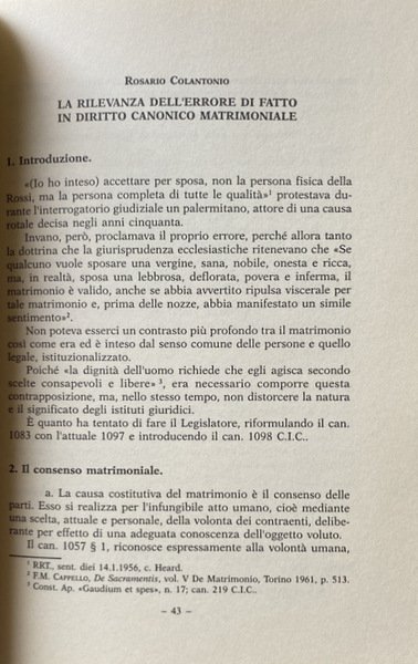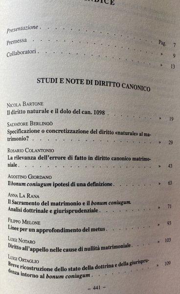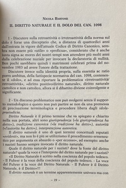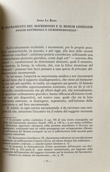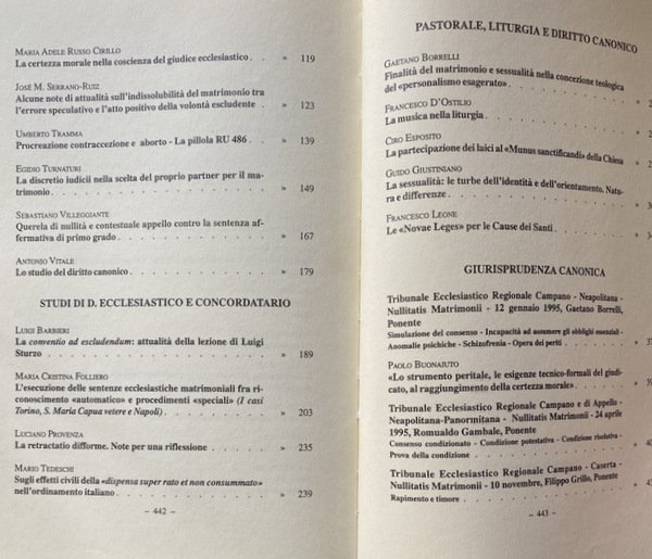 Soggetti: Diritto canonico ed ecclesiastico, Teologia, Opere generali, Studi in onore, Studi giuridici, Giurisprudenza, Chiesa, Sentenze, Diritto canonistico, Tribunale ecclesiastico, Giuristi, Sacra Rota, Diritto naturale, Bonum coniugum, Sacramenti, Matrimonio, Divorzio, Nullità, Annullamento, Errore di fatto, Dottrina, Analisi dottrinale, Metus, Dolo, 1098, Appello, Morale, Giudice ecclesiastico, Discretio iudicii, Querela, Volontà, Indissolubilità, Coniugi, Conventio ad excludendum, Procedimenti speciali, Santa Maria Capua Vetere, Napoli, Torino, Riconoscimento automatico, Retractio, Dispensa super rato et non consummato, Luigi Sturzo, Sessualità, Musica sacra, Liturgia, Laici, Munus santificandi, Identità, Orientamento sessuale, Novae Leges, Cause dei Santi, Neapolitana nullitatis matrimoni, Gaetano Borrelli, Ponente, Simulazione, Consenso, Obblighi essenziali, Incapacità, Disturbi psichici, Schizofrenia, Romualdo Gambale, Panormitana, Prova, Condizione potestativa, Filippo Grillo, Rapimento, Timore, Donna, Cura, Segnatura Apostolica, Pontificia Università, Libri rari Vintage fuori catalogo, Critica, Interpretazione, Tradizione canonica, Codice, Norme, Leggi, Suarez, Sant'Agostino, San Tommaso d'Aquino, Troeltsch, Grozio, Rousseau, Kant, Paolo VI, Pio XII, Istituzioni giuridiche, Diritto divino, Canone 1055, Concilio ecumenico, Clero, Autorità, Davino, Staffa, Gaudium e Spes, Bonnet, Fattispecie negoziali, Fumagalli, Carulli, Normativa, Errore ostativo, Interruzione di gravidanza, Aborto, Fecondazione, Feto, Pillola contraccettiva, Contraccezione, RU 486, Corpo, Diritti civili, Margaret Mead, Coscienza, Autonomia, Esclusione, Libertà, Ragione, Certezza morale, Giustizia, Codex Iuris Canonici, R. Bertolino, P. Pellegrino, Magistero, Sentenza coram Pinto, Sacerdozio neotestamentario, Lumen Gentium, Battesimo, Confermazione, Eucaristia, Organo sacro, Canti religiosi, Scholae cantorum, Cappelle, Cappella musicale, Istruzione, Papa, Pasqua, Canto gregoriano polifonico, Formazione, Riti, Rituali, Culto, Congregazione, Doms, Krempel, Rocholl, Cattolicesimo, Collezionismo, M. Tedeschi, A. Carlo Jemolo, Concordato, Fascismo, Omosessualità, Travestitismo, Inchieste diocesane, Editti, Encicliche, Canon and Ecclesiastical Law, Theology, General Works, Studies in Honor, Legal Studies, Jurisprudence, Church, Sentences, Canon Law, Ecclesiastical Tribunal, Jurists, Sacra Rota, Natural Law, Sacraments, Marriage, Divorce, Nullity, Annulment, Error of fact , Doctrine, Doctrinal analysis, Dolo, Appeal, Ecclesiastical judge, Discretio iudicii, Lawsuit, Will, Indissolubility, Spouses, Special proceedings, Naples, Turin, Automatic recognition, Sexuality, Sacred music, Liturgy, Laity, Identity, Sexual orientation, Causes of Saints, marriages, Simulation, Consent, Essential obligations, Incapacity, Mental disorders, Schizophrenia, Trial, Potestative condition, Kidnapping, Fear, Women, Treatment, Apostolic Signatura, Pontifical University, Rare books out of print, Criticism, Interpretation, Canonical tradition, Codex, Norms, Laws, St. Augustine, St. Thomas Aquinas, Grotius, Paul VI, Pius XII, Juridical institutions, Divine law, Canon, Quorums ecumenical, Clergy, Authority, Negotiating matters, Regulations, Obstructive error, Interruption of pregnancy, Abortion, Fertilization, Fetus, Contraceptive pill, Contraception, Body, Civil rights, Women, Conscience, Autonomy, Exclusion, Freedom, Reason, Moral certainty, Justice, Magisterium, New Testament priesthood, Baptism, Confirmation, Eucharist, Sacred organ, Religious chants, Chapels, Musical chapel, Education, Pope, Easter, Polyphonic Gregorian chant, Formation, Rites, Rituals, Worship, Congregation, Catholicism, Collecting, Concordat, Fascism, Homosexuality, Transvestism, Diocesan inquiries, Edicts, Encyclicals