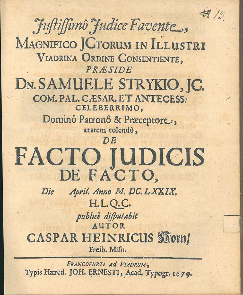 Justissimo Judice Favente, Magnifico JCtorum in Illustri Viadrina ordine Consentiente. De Facto Judicis de Facto