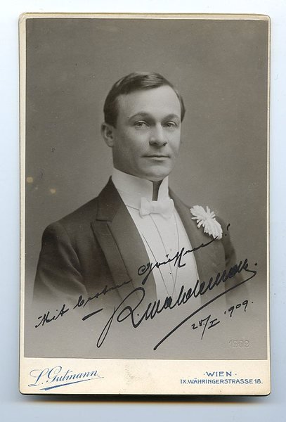 166:108 mm. Mit besten Grüßen! | RWaldemar. - Richard Waldemar erhielt 1890 sein erstes Engagement in Troppau. Über München und Wiesbaden kam er 1893 nach Wien, "wo er sich erst im ernsten Genre versuchte, ehe sein Komikertalent entdeckt wurde. Er trat an zahlreichen Wiener Bühnen auf. Waldemars Wirken ist mit der Entwicklung der Wiener Operette um die Jahrhundertwende eng verbunden. Später spielte er auch in Stumm- und Tonfilmen mit und war für den Rundfunk tätig" (DBE). - Aus dem Atelier L. Gutmann, Wien.