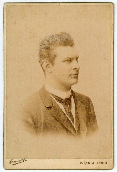 164:108 mm. Schönes Brustbild aus dem Atelier des k. u. k. Hofphotographen Rudolf Krziwanek, Wien. Mit Widmung verso: "Vor Menschen sei ein Mann. Vor Gott ein Kind".