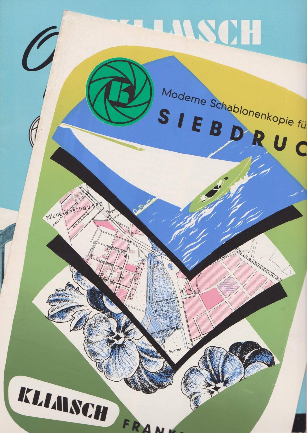 Eingeheftet sind 25 einseitig bedruckte Blätter zum Klimsch-Variomat und 1 doppelseitiger Prospekt. Weitere 5 Prospekte befinden sich in der Lasche gegenüber (Offseteinrichtungen, Vakuprint, Schleuderapparate, Schablonenkopierer, Reproduktions-Einrichtungen). Prospekte mehrfarbig und in ansprechender zeittypischer Gestaltung.