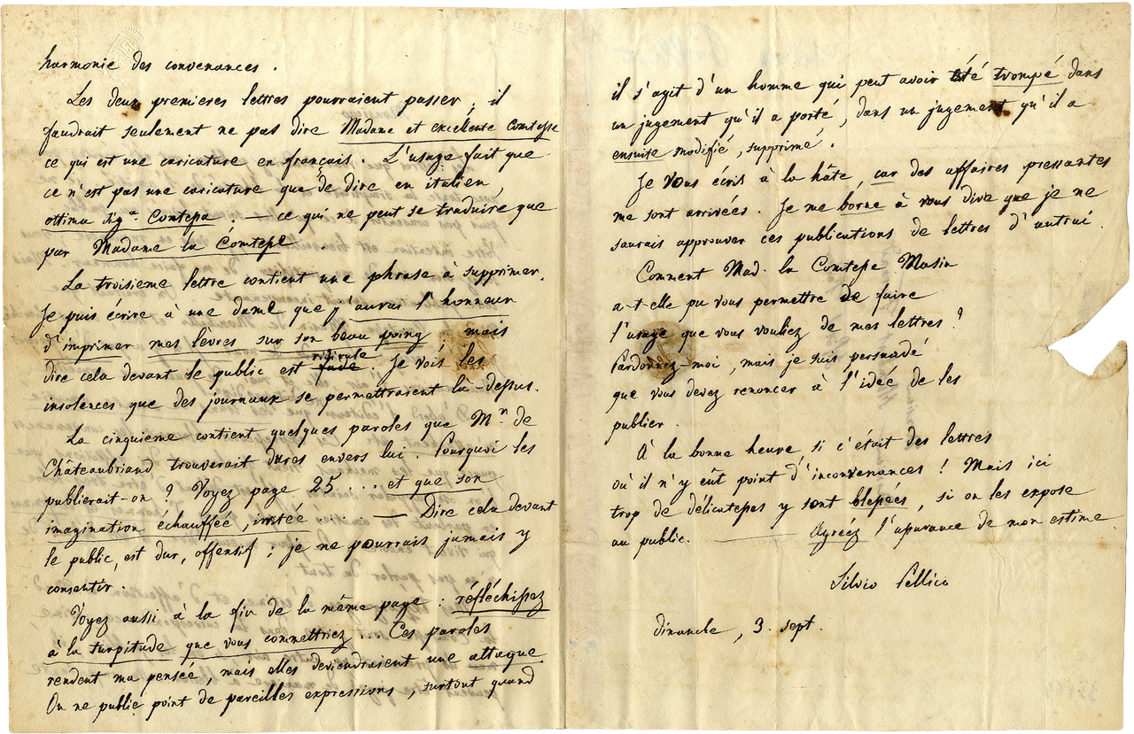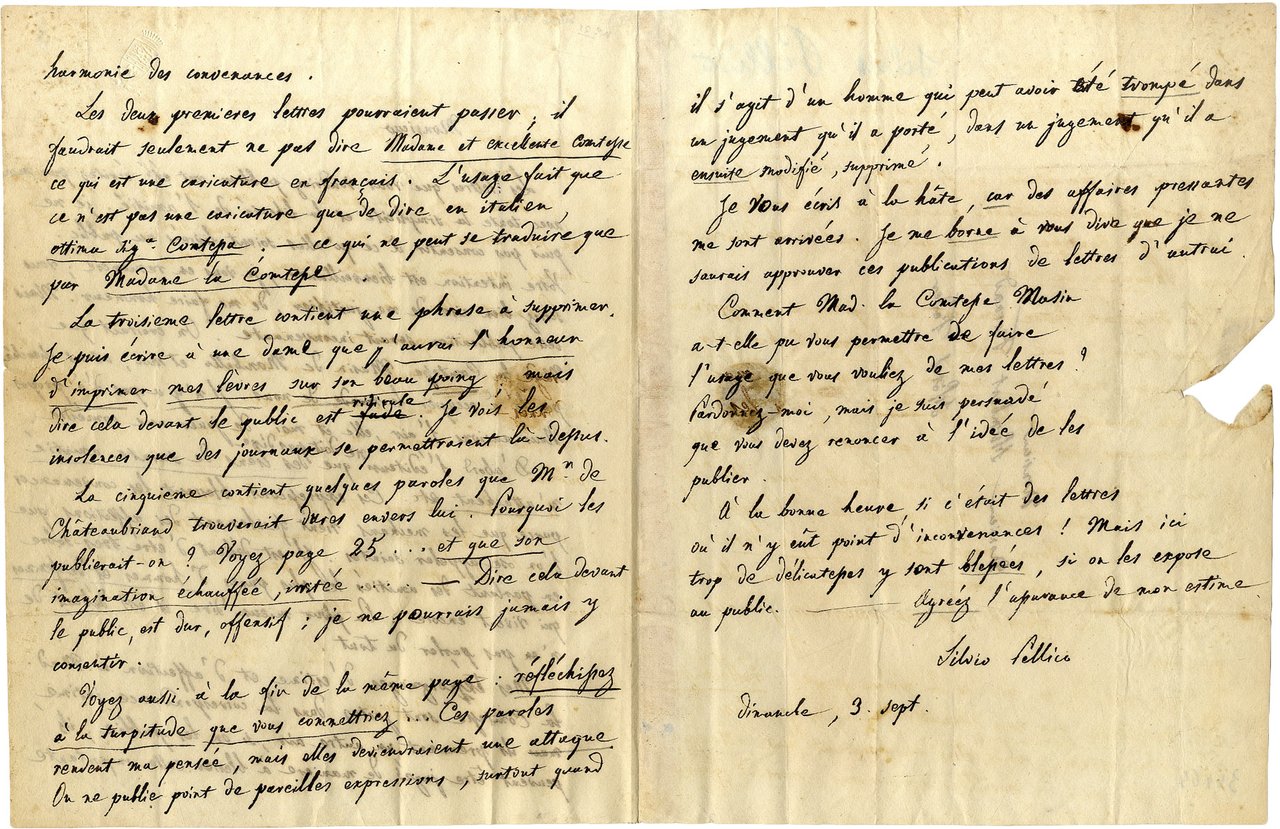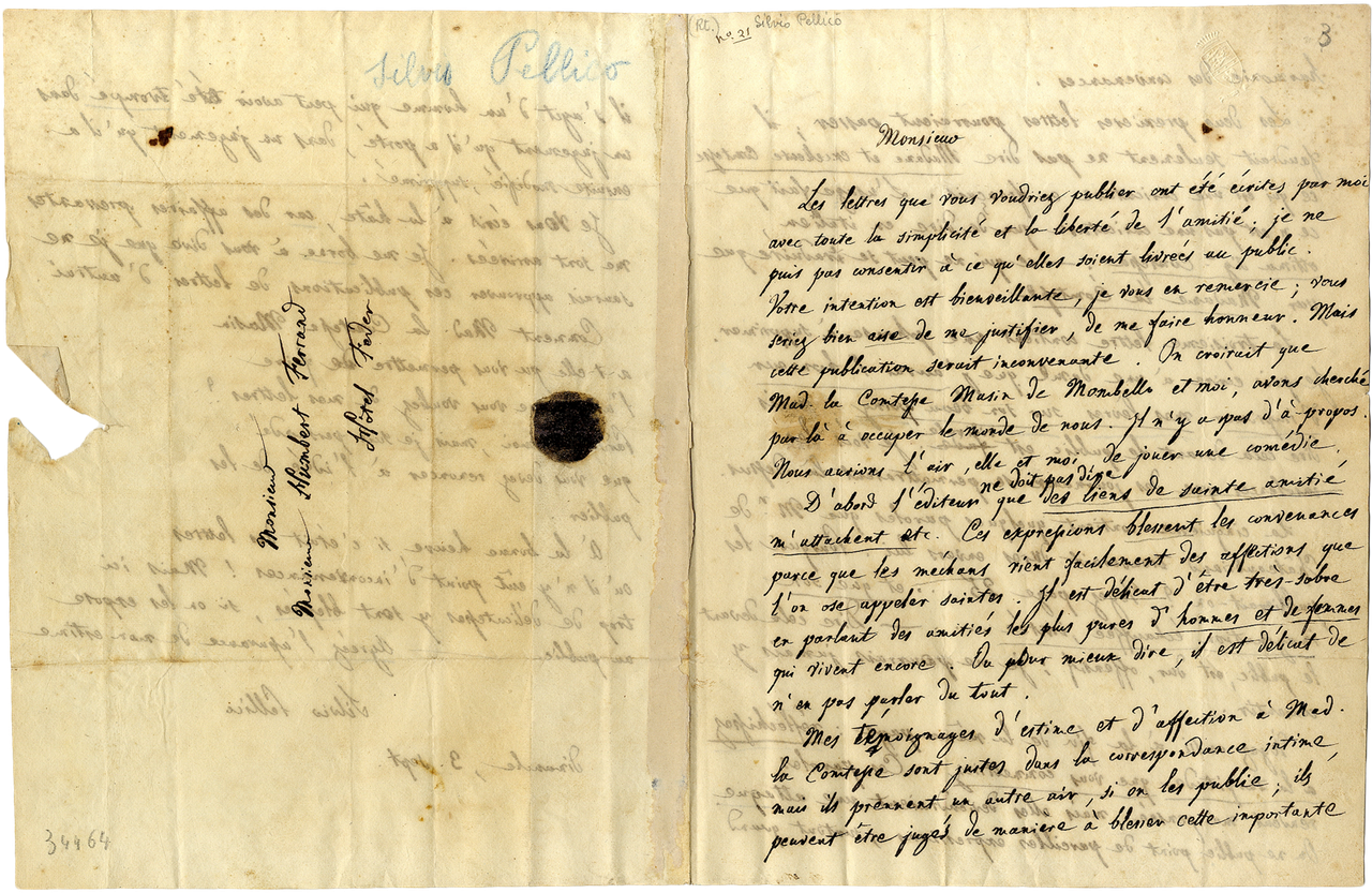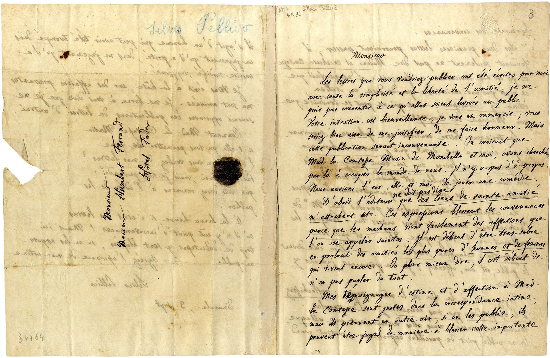>4 pp. in-4 (258x194 mm), indirizzo sulla quarta pagina, lettera autografa firmata, chiaramente vergata in francese. Pellico nega al suo corrispondente il permesso di pubblicare una serie di lettere tra lui e la Contessa Masin di Mombello, poichè troppo private. ''...Les lettres que vous voudriez publier on été écrites par moi avec toute la simplicité et la liberté de l'amitié; je ne puis pas consentir à ce qu'elles soient livrées au public. Votre intention est bienveillante, je vous en remercie; vous seriez bien aise de me justifier, de me faire honneur. Mais cette publication serait inconvenante. On croirait que Mad. la Comtesse Masin de Mombello et moi, avons cherché par là à occuper le monde de nous. Il n'y a pas d'à propos...Mes temoignages d'estime et d'affection à Mad. la Contesse sont justes dans la correspondance intime, mais ils prennent un autre air, si on les publie, ils peuvent etre jugés de maniere à blesser cette importante harmonie et convenance...''