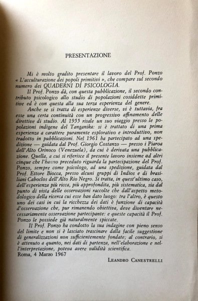 Mi è molto gradito presentare il lavoro del Prof. Ponza «L'acculturazione dei popoli primitivi», che compare sul secondo numero dei QUADERNI DI PSICOLOGIA.