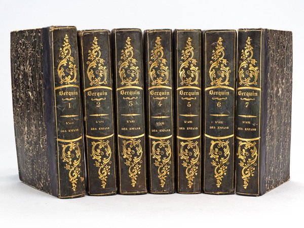 Nouvelle édition, rangée dans un meilleur ordre, 7 vol. in-12 reliure de l'époque demi-veau noir, dos lisses ornés en long, Oeuvres complètes de Berquin, tomes 1 à 7, Chez Ant. Aug. Renouard, Paris, XI - 1803, 334 pp. et 19 planches ; 350 pp. et 21 planches ; 356 pp. et 16 planches ; 323 pp. et 15 planches ; 359 pp. et 9 planches ; 399 pp. et 9 planches ; 310 pp. et 9 planches, soit un total de 98 planches hors texte (y compris les frontispices) Bon état pour cet exemplaire bien complet des 7 tomes contenant l'intégralité de "L'Ami des Enfans", complet des "7 frontispices et 91 figures charmantes" signalées par Cohen, et constituant les 7 premiers tomes des 17 tomes des Oeuvres complètes de Berquin (reliures un peu frottées, qq. ressauts et traces d'usage). Cohen, I, 143. Natif de Bordeaux, Arnaud Berquin (1747-1791) fut notamment le précepteur des deux filles de l'éditeur Panckoucke ; il reste l'un des grands précurseurs de la littérature pour enfants. Cette excellente édition Renouard réunit sous le titre commun d’Ami des enfants, l’Ami des enfants et l’Ami de l’adolescence. Renouard a organisé dans un ordre raisonné et proportionné aux progrès de l’intelligence, les contes et drames que Berquin livrait tous les mois à ses souscripteurs. A cet exemplaire nous joignons un courrier signé de Denise Escarpit, présidente de la Société Internationale de Recherche en Littérature d'Enfance et de Jeunesse, adressé à Michel Suffran, à propos du Congrès à venir à Bordeaux en septembre 1983, dans lequel elle évoque Berquin et lui demande si, collectionneur de livres d'enfants, il disposerait d'ouvrages de Berquin à prêter pour l'exposition. Au verso, quelques lignes manuscrites de Michel Suffran à propos de Berquin : "Terme un peu condescendant de "Berquinade". Berquin, l'un des premiers (et bien plus que Rousseau) a, [ . ] tenté de donner la parole aux enfants - ou de reconstituer leur langage. En ce sens n'est-il pas un ancêtre de la chère comtesse de Ségur ?"