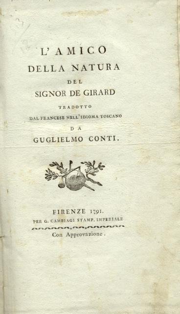 Operetta dedicata alla contessa Maria Anna Acciajuoli. Traduzione dal francese nell'idioma toscano di Guglielmo Conti. Cm.18,5x10,5. Pg.16,96. Gradevole volumetto in barbe, con buona marginatura. Coperta cartonata con elementi decorativi. Codice libreria 26513.