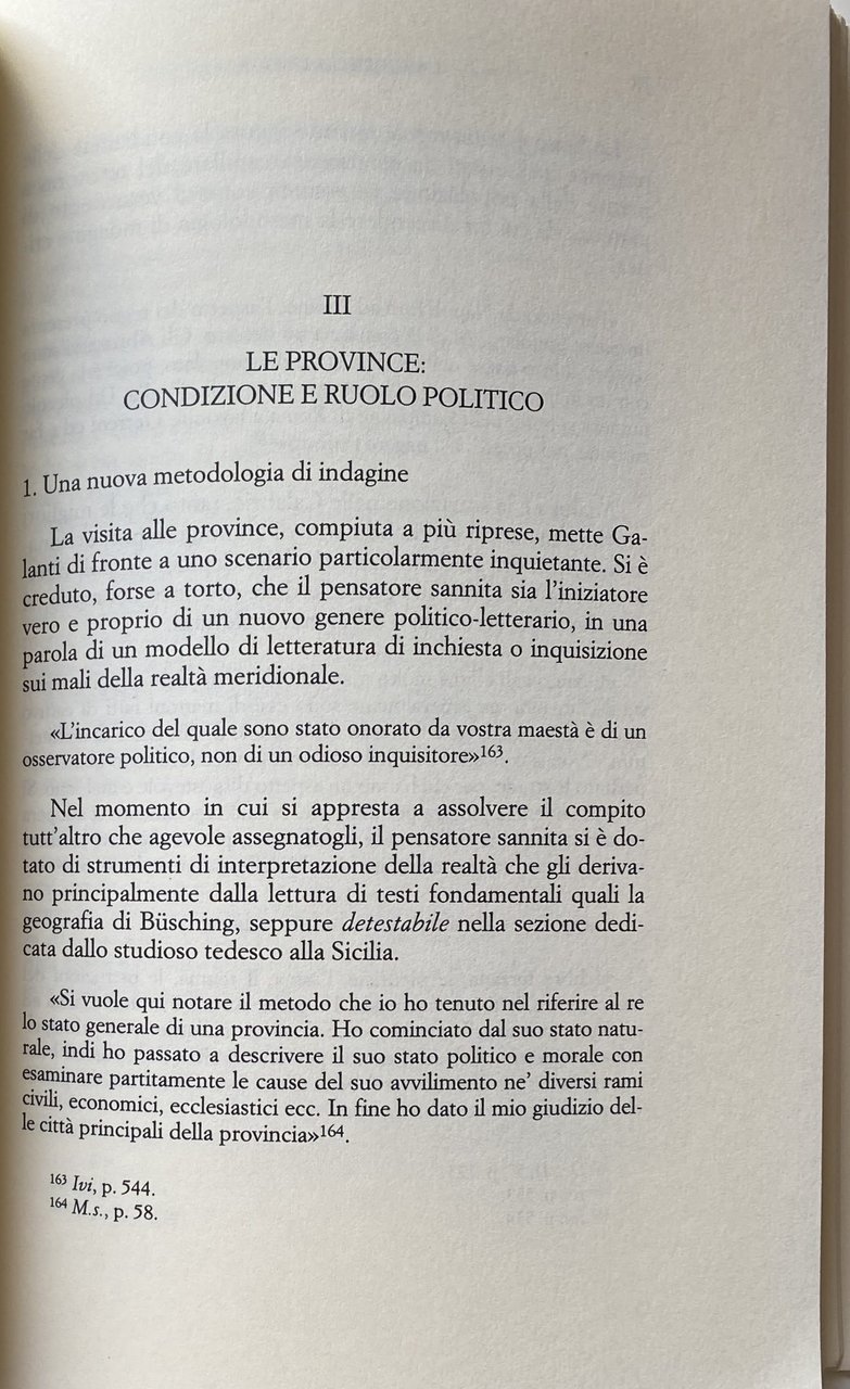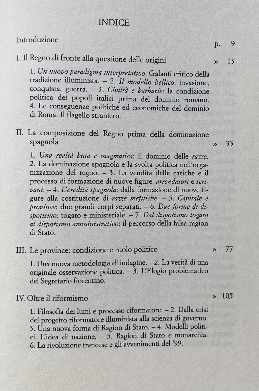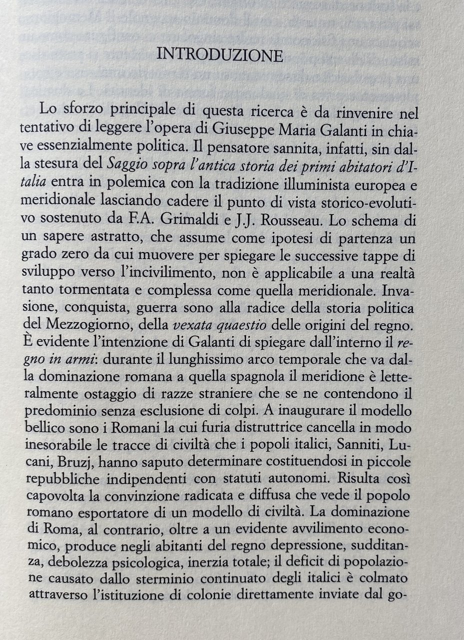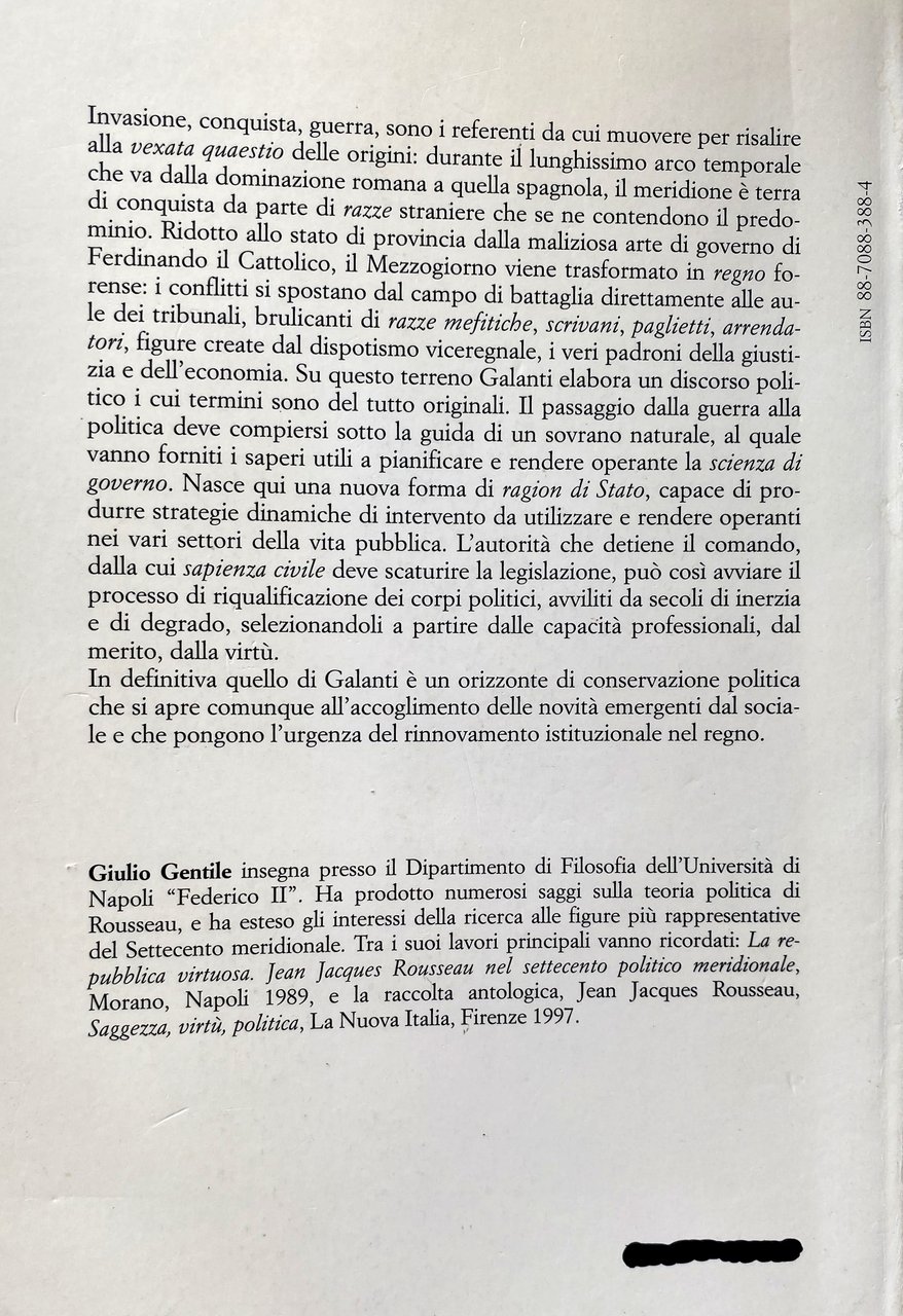 Invasione, conquista, guerra, sono i referenti da cui muovere per risalire alla vexata quaestio delle origini: durante il lunghissimo arco temporale che va dalla dominazione romana a quella spagnola, il meridione è terra di conquista da parte di razze straniere che se ne contendono il predo minio. Ridotto allo stato di provincia dalla maliziosa arte di governo di Ferdinando il Cattolico, il Mezzogiorno viene trasformato in regno forense: i conflitti si spostano dal campo di battaglia direttamente alle aule dei tribunali, brulicanti di razze mefitiche, scrivani, paglietti, arrendatori, figure create dal dispotismo viceregnale, i veri padroni della giustizia e dell'economia. Su questo terreno Galanti elabora un discorso politico i cui termini sono del tutto originali. Il passaggio dalla guerra alla politica deve compiersi sotto la guida di un sovrano naturale, al quale vanno forniti i saperi utili a pianificare e rendere operante la scienza di governo. Nasce qui una nuova forma di ragion di Stato, capace di produrre strategie dinamiche di intervento da utilizzare e rendere operanti nei vari settori della vita pubblica. L'autorità che detiene il comando, dalla cui sapienza civile deve scaturire la legislazione, può così avviare il processo di riqualificazione dei corpi politici, avviliti da secoli di inerzia e di degrado, selezionandoli a partire dalle capacità professionali, dal merito, dalla virtù. In definitiva quello di Galanti è un orizzonte di conservazione politica che si apre comunque all'accoglimento delle novità emergenti dal sociale e che pongono l'urgenza del rinnovamento istituzionale nel regno.