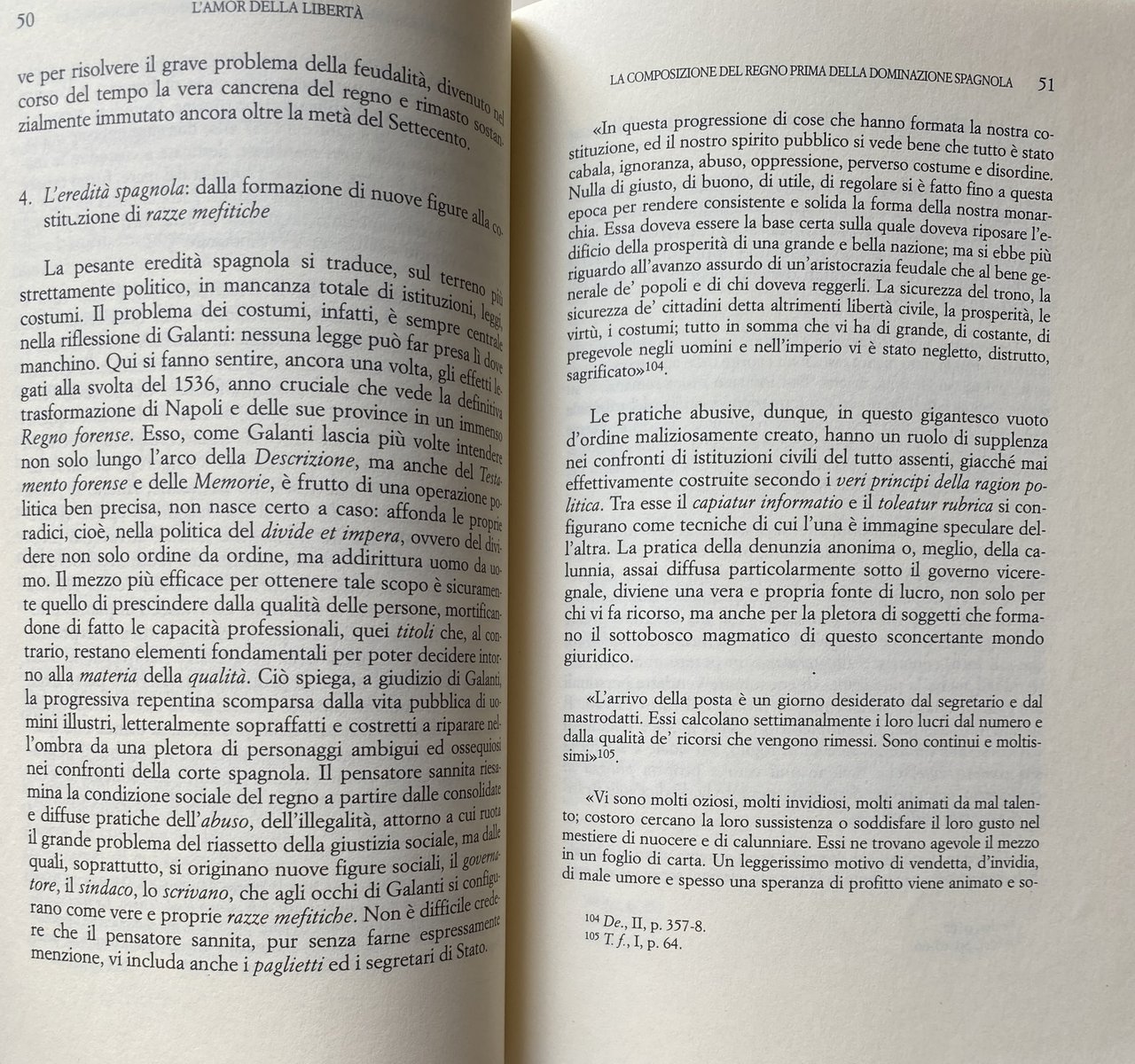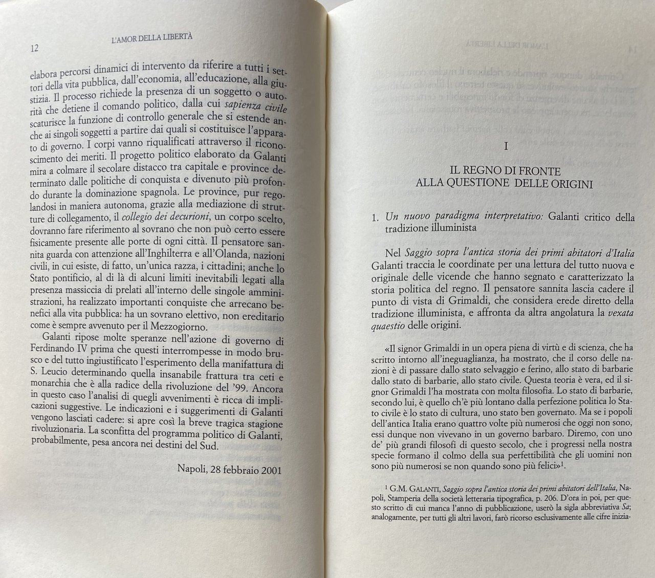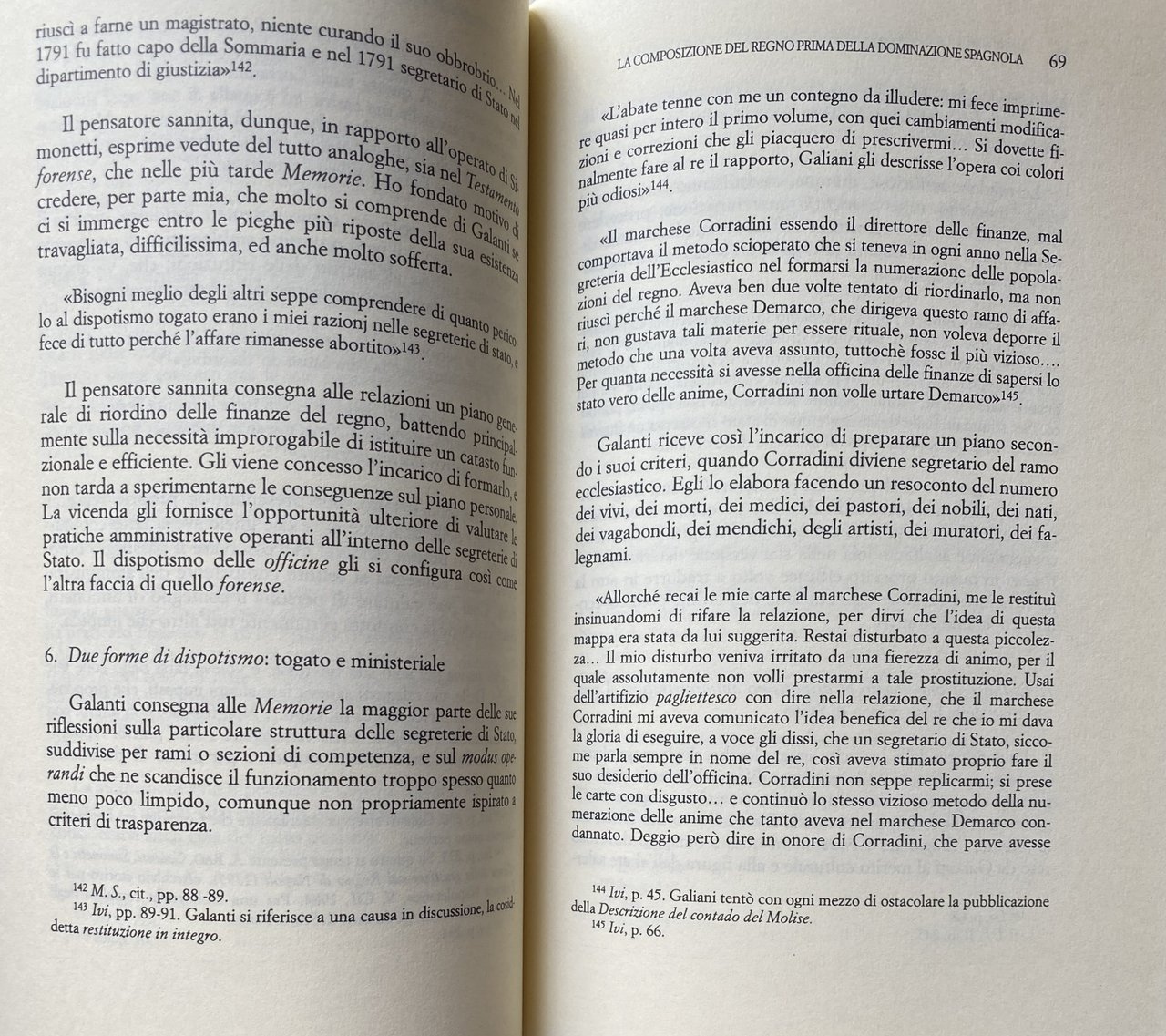 Invasione, conquista, guerra, sono i referenti da cui muovere per risalire alla vexata quaestio delle origini: durante il lunghissimo arco temporale che va dalla dominazione romana a quella spagnola, il meridione è terra di conquista da parte di razze straniere che se ne contendono il predo minio. Ridotto allo stato di provincia dalla maliziosa arte di governo di Ferdinando il Cattolico, il Mezzogiorno viene trasformato in regno forense: i conflitti si spostano dal campo di battaglia direttamente alle aule dei tribunali, brulicanti di razze mefitiche, scrivani, paglietti, arrendatori, figure create dal dispotismo viceregnale, i veri padroni della giustizia e dell'economia. Su questo terreno Galanti elabora un discorso politico i cui termini sono del tutto originali. Il passaggio dalla guerra alla politica deve compiersi sotto la guida di un sovrano naturale, al quale vanno forniti i saperi utili a pianificare e rendere operante la scienza di governo. Nasce qui una nuova forma di ragion di Stato, capace di produrre strategie dinamiche di intervento da utilizzare e rendere operanti nei vari settori della vita pubblica. L'autorità che detiene il comando, dalla cui sapienza civile deve scaturire la legislazione, può così avviare il processo di riqualificazione dei corpi politici, avviliti da secoli di inerzia e di degrado, selezionandoli a partire dalle capacità professionali, dal merito, dalla virtù. In definitiva quello di Galanti è un orizzonte di conservazione politica che si apre comunque all'accoglimento delle novità emergenti dal sociale e che pongono l'urgenza del rinnovamento istituzionale nel regno.