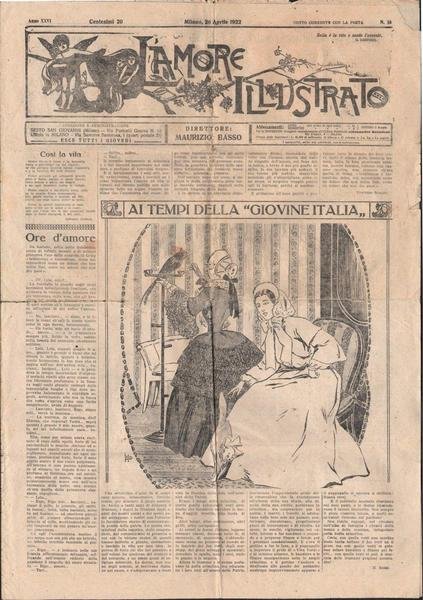 L'AMORE ILLUSTRATO-MILANO 22 APRILE 1922. PP. 4-CM. 50 X 35. RARO GIORNALE DI LETTERATURA PROSA E POESIA DIRETTO DA MAURIZIO BASSO, EDITO ALLA VIGILIA DELLA MARCIA SU ROMA PRECARIE CONDIZIONI- STRAPPO DI CM. 11 ALLA PIEGA CENTRALE LATO SINISTRO CHE INTERESSA TUTTE LE PAGINE, STRAPPO DI CM. 6 ALLA PIEGA CENTRALE LATO DESTRO DELLA PRIMA PAGINA, MANCANZA ALL'ANGOLO SUPERIORE DESTRO DELLA PRIMA PAGINA DI CM. 3 X 2. PIEGHE CENTRALI.