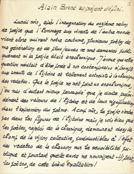 Pierre Seghers éditeur 1952 Genêve, Club du Poème, sans date, 1962. In-4 broché, en fait présenté comme un grand carnet, composé de lettres détachables, avec des fac-similés de poèmes inédit manuscrits. Couverture illutrée de Jean SAUSSAC. Non paginé. Lettres detachables prêtes à être envoyer comme lettre, pourtour gommé pour fermer l'envoi. Rare Complet. Tirage à 1000 exemplaires et quelques exemplaires hors commerce, dont celui-ci fait parti. Bel envoi à Jean Digot, Rodez, Pentecôte 1962. Joint un courrier de Jean Rousselot (signé non daté) pour "honorer" Alain Borne. Joint également un manuscrit de 11 pages daté signé du 14 mars 1963 de Edmond Humeau "Alain Borne au présent défini". Manuscrit dans lequel il ne manque pas de faire également l'éloge de jean Digot ayant fait paraitre dans "Les feuillets de l'Ilôt" les premiers poèmes d'Alain Borne (Cicatrices des songes), ainsi que son initiative le 21 avril 1963 d'édifier à Rodez durant le prix Antonin Artaud, un mur d'hommage à Alain Borne par ses amis. Alain Borne (né le 12 janvier 1915 à Saint-Pont, décédé le 21 décembre 1962 dans un accident de voiture).