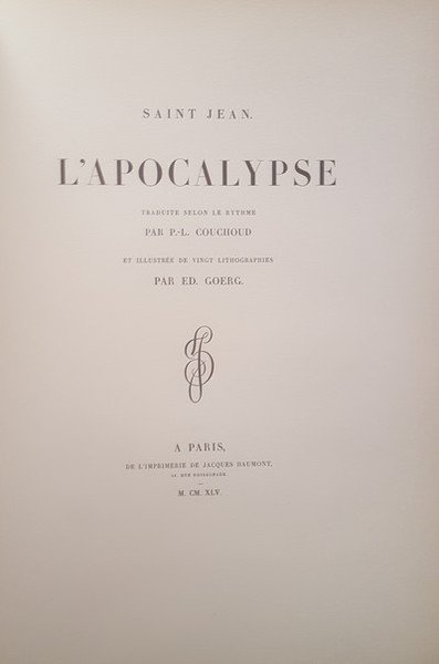 de l'imprimerie de Jacques Haumont 1945 A Paris, de l'imprimerie de Jacques Haumont 1945. Grand in-folio carré en feuillets sous couverture rempliée de 58 pages + 20 lithographies originales hors-texte d'Edouard Goerg. Traduite selon le rythme par P. L. Couchoud. Tirage limité numéroté à 198 exemplaires. Celui-ci, 1 des 118 exemplaires sur vélin d'Arches numérotés de 41 à 158 et portant le n° 70. Rares rousseurs en bord de couverture et sur les tranches, sinon très bon état.