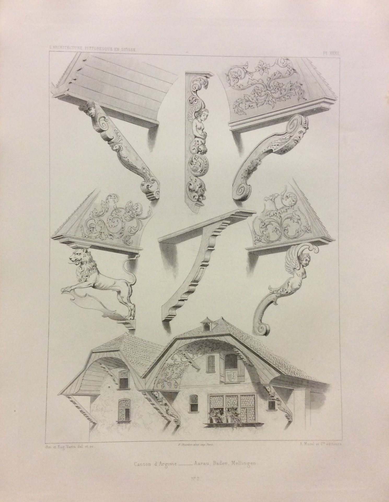 In folio (mm. 403x285), cartelletta in mz. tela con legacci (lievi tracce d'uso), titolo oro al dorso, contenente, a fogli sciolti, pp. (4),IV di testo e 48 belle tavole inc. in rame, disegnate dai F.lli Varin, che raffigurano: insiemi, facciate, dettagli di costruzioni dei cantoni di Appenzell, Argovia, Berna, Schitzw, Turgovia e Unterwald. Lievi fioriture marginali, altrimenti esemplare ben conservato.