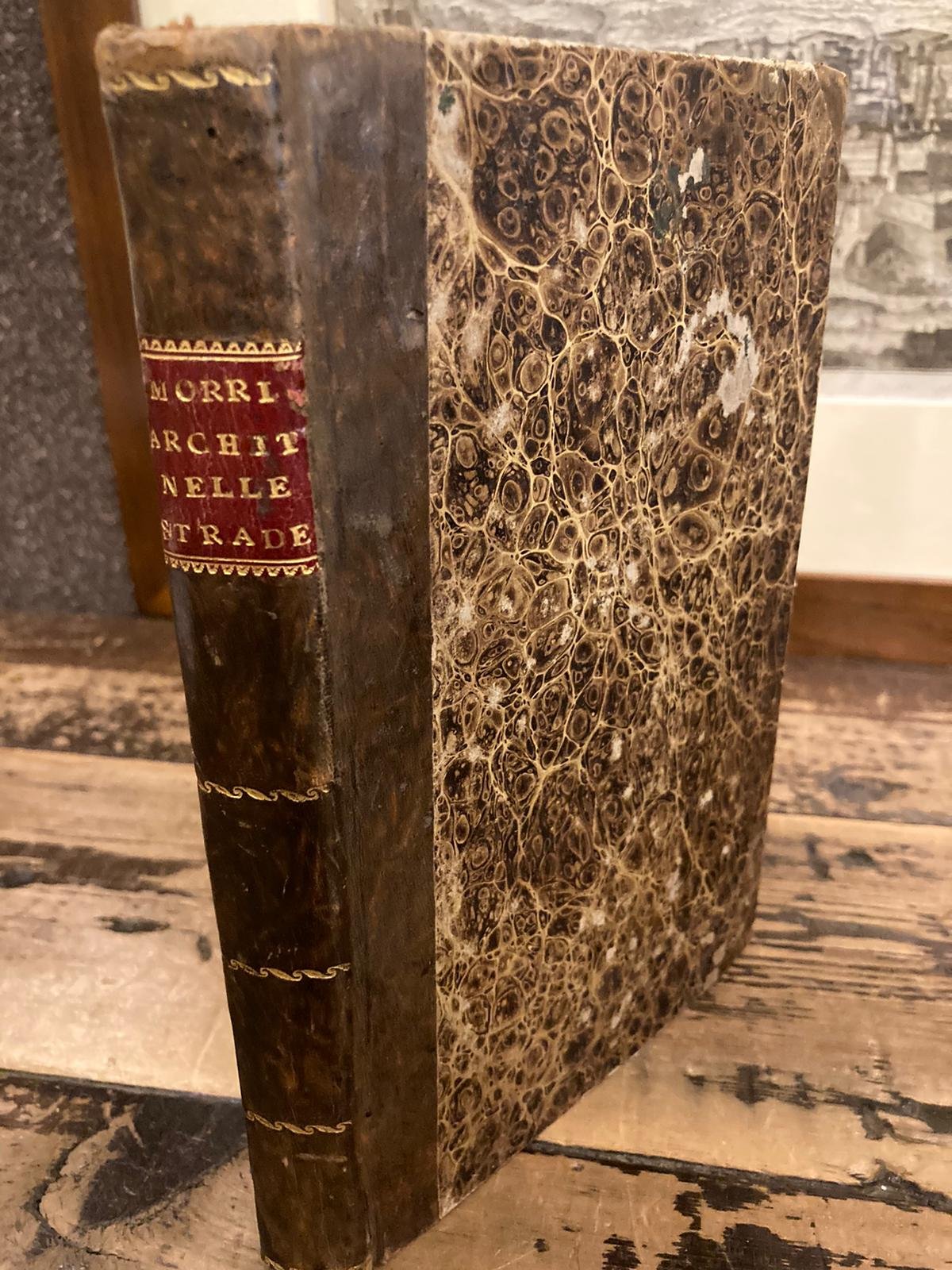 In-8° (220x140mm), pp. VIII, 204, in fine, 5 grandi tavole incise ripiegate. Legatura coeva in mezza pelle marrone con titolo in oro su tassello al dorso, tagli a spruzzo rossi, bell'esemplare. Dall'indice: Strade antiche e moderne. Delle Strade nelle citta'. Leggi relative alle strade pubbliche . De' Ponti. Delle Fontane.