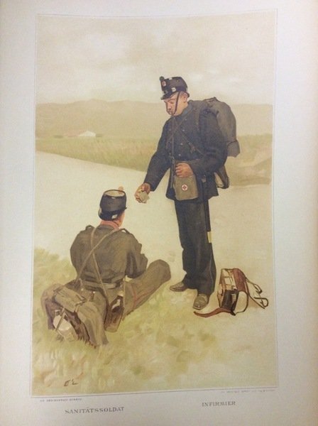 In folio (mm. 417x292), mz. pelle coeva, dorso a cordoni (con abrasioni) e titolo oro, conserv. la bella copertina in brossura orig. figurata a colori, pp. (6),73,(3), ornato da grandi testate e finali, molto ben illustrato da 34 pregevoli tavole, litografate a colori, che rappresentano con grande esattezza ufficiali e soldati svizzeri delle diverse armi, realizzate da Estoppey. Vi sono dettagliatamente descritti: L'Infanterie (organisation, recrutement, instruction, habillement, armément et équipement) - La Cavalerie - L'Artillerie - Le Génie (organisation avant 1874 et actuelle, recrutement.. , pionniers du landsturm, matériel) - L'Etat-Major général - Les troupes d'administration - Les troupes sanitaires (formation et instruction.. , mission du personnel sanitaire en campagne, service sanitaire sur les derrières de l'armée, aide volontaire) - Le service vétérinaire (officiers vétérinaires, maréchaux ferrants militaires, dépots de chevaux. Cfr. Benezit,V, p. 198: David Estoppey (1862-1952), peintre de paysages, dessinateur, illustrateur, lithographe, il fonda un atelier à Genève qui comptait Alberto Giacometti parmi ses élèves.Esemplare ben conservato.