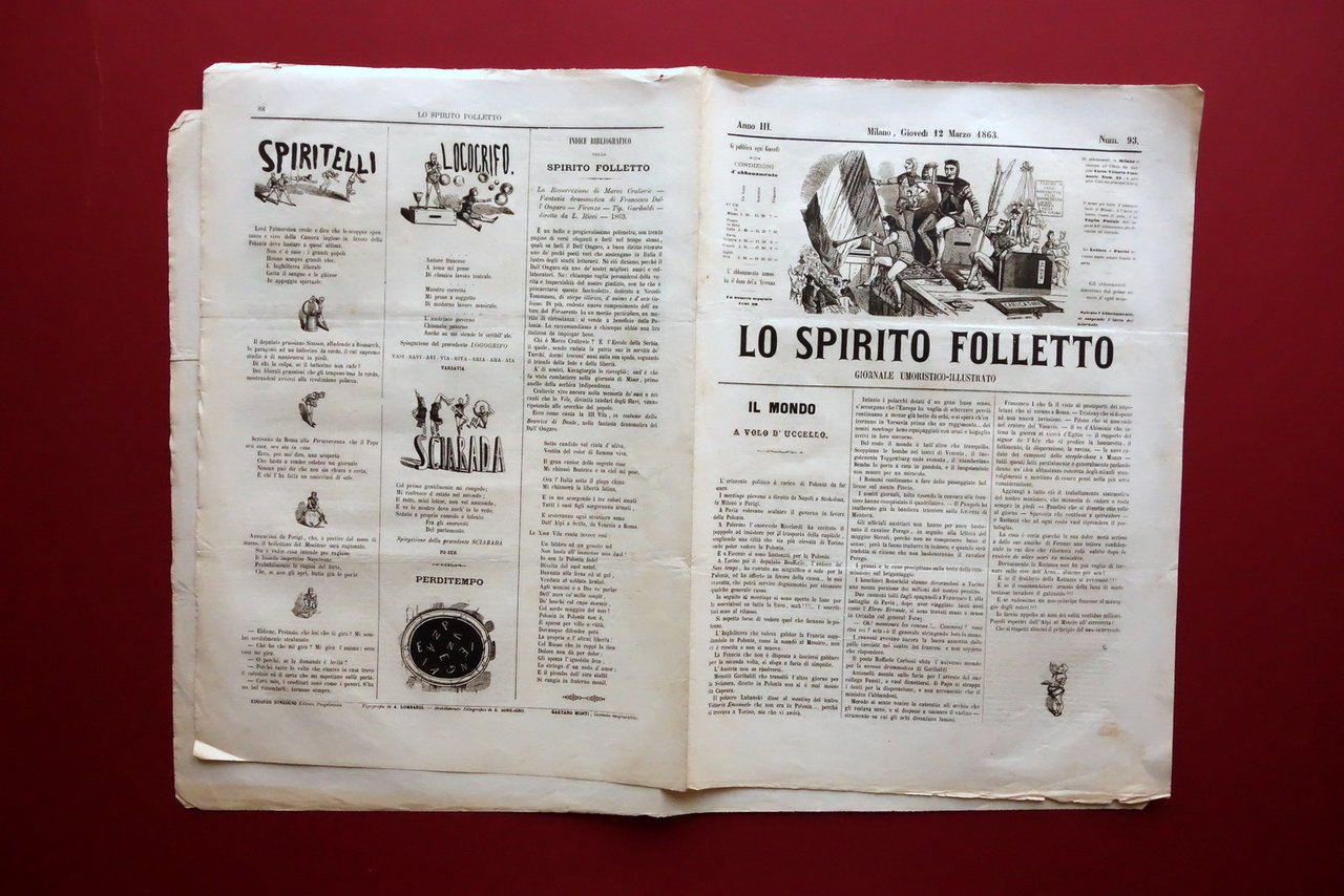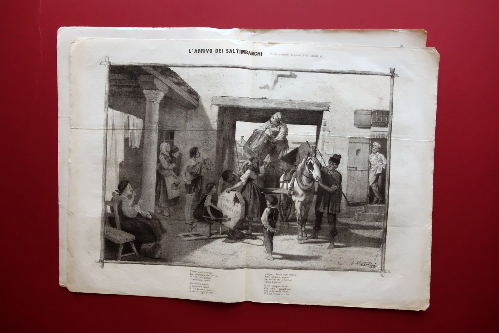 Giornale umoristico illustrato, L'arrivo dei Saltimbanchi (quarto quadretto di genere di E. Cadolini)" grande illustrazione in bianco e nero alla doppia pagina centrale de "Lo Spirito Folletto" Anno III - numero 93 Milano, 12 marzo 1863 Milano, 1863; pp. da 81 a 88 (esemplare autonomo con numerazione progressiva annuale), con varie ill. a colori e doppia pagina centrale ill. a colori. Esemplare a fogli sciolti. Numero completo. Condizioni di conservazione Buone condizioni con tracce d'uso e minimi segni del tempo, alcune piccole lievi bruniture, alla metà superiore una lieve traccia di piega. Numero completo. SC03.D19358 N F "