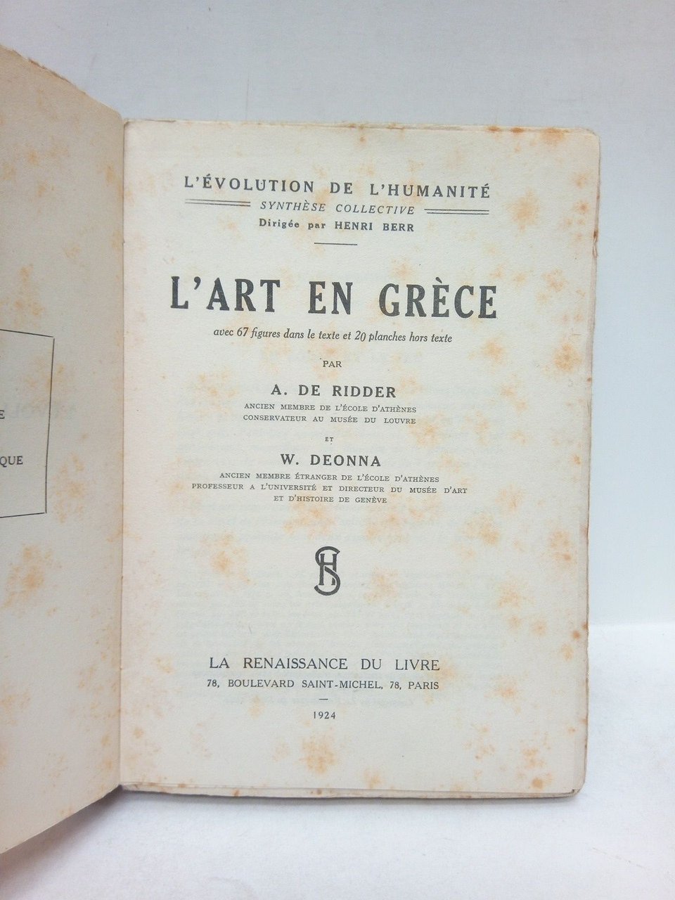 Paris: La Reinaissance du Livre, 1924.- XXVIII, 430 p. avec 66 figures et 23 planches hors-texte; 4º menor (20,2 x 14,3 cm); Texto en francés; Rústica Ed.- (Bibl. de Synthèse Historique. L'Évolution de l'Humanité. 12).* Moteado de humedad, especialmente las últimas 8 hojas. El pie del lomo con una pequeña falta. Excepto las láminas que están perfectamente. ARTE EN GENERAL E HISTORIA EN GENERAL DEL ARTE