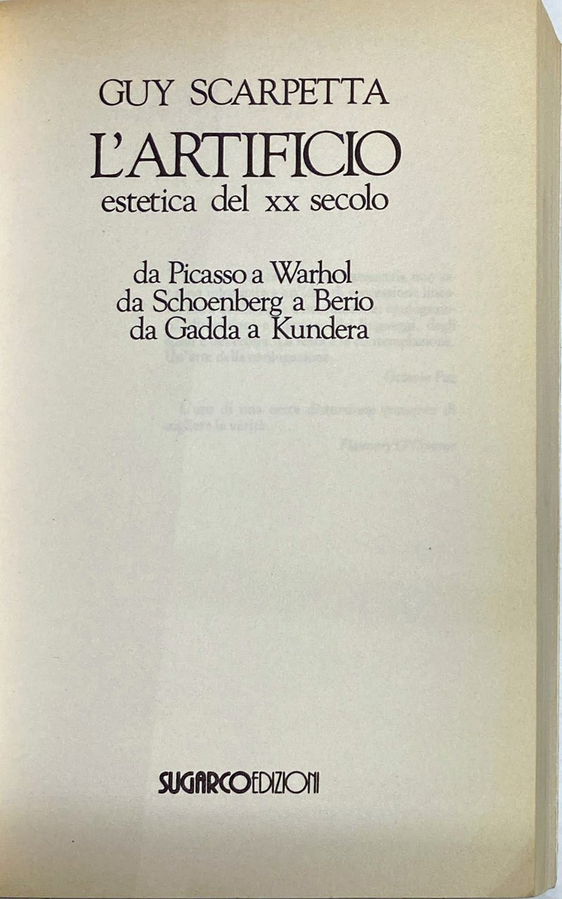 L'ARTIFICIO. ESTETICA DEL XX SECOLO DA PICASSO A WARHOL DA SCHOENBERG A BERIO DA GADDA A KUNDERA | Libros antiguos y modernos | Guy Scarpetta, Donatello Bellomo