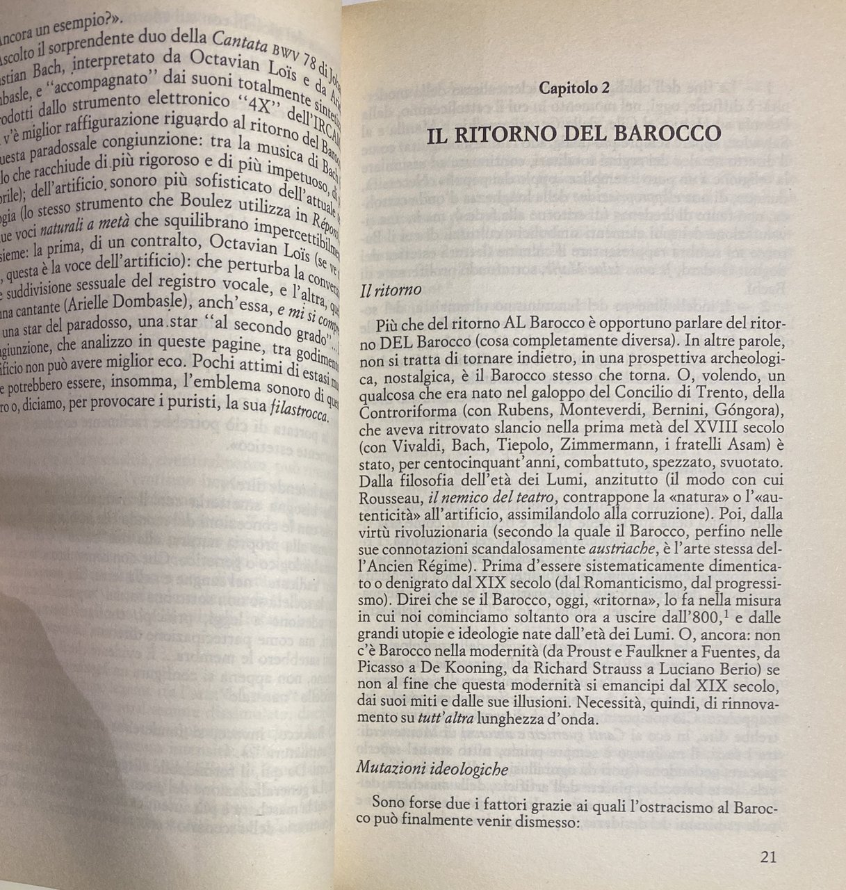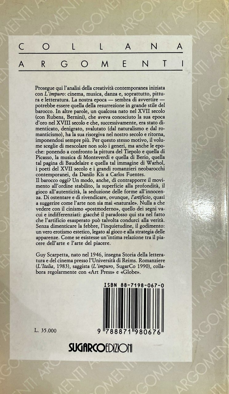 Prosegue qui l'analisi della creatività contemporanea iniziata con L'impuro: cinema, musica, danza e, soprattutto, pittura e letteratura. La nostra epoca sembra di avvertire potrebbe essere quella della resurrezione in grande stile del barocco. In altre parole, un qualcosa nato nel XVII secolo (con Rubens, Bernini), che aveva conosciuto la sua epoca d'oro nel XVIII secolo e che, successivamente, era stato dimenticato, denigrato, svalutato (dal naturalismo e dal romanticismo), ha la sua risorgiva nel nostro secolo e ritorna, imponendosi sempre più. Per questo stesso motivo, il volume sceglie di mescolare non solo i generi, ma anche le epoche: ponendo a confronto la pittura del Tiepolo e quella di Picasso, la musica di Monteverdi e quella di Berio, quella tal pagina di Baudelaire e quella tal imagine di Warhol, poeti del XVII secolo e i grandi romanzieri neobarocchi contemporanei, da Danilo Kis a Carlos Fuentes. Il barocco oggi? Un modo, anche, di contrapporre il movimento all'ordine stabilito, la superficie alla profondità, il gioco all'autenticità, la seduzione delle forme all'innocenza. Di ostentare e di rivendicare, ovunque, l'artificio, quasi a suggerire come l'arte non sia mai naturale. Nulla a che vedere con il cinismo postmoderno, quello dei segni va cui e indifferenziati: giacché il paradosso qui sta nel fatto che l'artificio esasperato può talvolta condurci alla verità. Senza dimenticare la febbre, l'inquietudine, il godimento: un vero erotismo estetico, legato al gioco e alla strategia delle apparenze. Come se esistesse un'intima relazione tra il piacere dell'arte e l'arte del piacere.