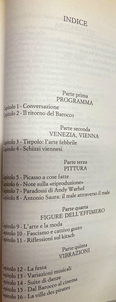 Soggetti: Arte, Critica, Storia, Estetica, Scrittura, Letteratura, Arti performative, Architettura, Cinema, Teatro, Pittura, Iconografia, Ideologia, Intellettuali, Cultura di massa, Libri universitari, Umanistica, Danza, Balletto, Musica, Stile, Correnti letterarie, Movimenti, Avanguardia, Poesia, Poetica, Fascismo, Brutalismo, Cattivo Gusto, Moda, Erotismo, Piacere, Impuro, Simbolismo, Artificio, Gillo Dorfles, Kitsch, L'impureté, Pensiero filosofico, Creatività, Libertinaggio, Creazione contemporanea, Impurity, Barocco, Rubens, Bernini, XVIII secolo, Naturalismo, Romanticismo, Generi, Giambattista Tiepolo, Picasso, Claudio Monteverdi, Charles Baudelaire, Andy Warhol, XVII secolo, Romanzieri, Carlos Fuentes, Illusione, Cinismo, Postmoderno, Antonio Saura, Luciano Berio, Bach, Bruno Schulz, Buñuel, Citizen Kane, Codice, Design, Corpo, Danilo Kis, Arredamento, Verità, Fantastico, Finzione, Film, Flannery O'Connor, Funzione, Forme, Fratelli Asam, Gallimard, Hermann Broch, Ideologie, Immagini, Godimento, Lezama Lima, Trucco, Metafora, Milan Kundera, Modernità, Mondo, Montaggio, Mozart, Musical, Musil, Mitologia, Narrazione, Octavio Paz, Opere, Paradosso, Personaggi, Trappola, Pina Bausch, Spot, Rappresentazione, Sogno, Roland Barthes, Romanzo, Romantico, Raul Raoul Ruiz, Schönberg, Seduzione, Sensualità, Segni sessuali, Simulacro, Surrealismo, Velázquez, Schizzi Viennesi, Città dei pirati, Visione, Orson Welles, Male, Suite, Riproducibilità, Riproduzione, Letture, Taccuini, Cipria, Bibliografia, Riferimento, Consultazione, Libri rari Vintage fuori catalogo, Collezionismo, Crisi, Multiculturalismo, Gongora, Mark Rothko, Vivaldi, Zimmer, Rapimento di Proserpina, Mostruosità, Deformazione, Messerschmidt, Wurzburg, El Greco, De Kooning, Arnulf Rainer, Carne, Artaud, Brecht, Bob Wilson, Tadeusz Kantor Spettacolo Baltasar Gracian Don Giovanni Berg Bordello Avignone Kline Surrealismo Pollock Turner Francisco Goya Capricci Divertimento Haim Steinbach Jugendstil Klimt Lelouch Bauhaus Mies Van Robe Basquiat Oscenità Osceno Consumo Accumulazione Supermercato Plastica Fassbinder Duchamp Prodotti Merce Pubblicità Marketing De Kooning Espressionismo Minestra Campbell Brillo Madonna Mao Coca-Cola Marilyn Monroe Elvis Baudrillard Spatstil Profanazione Purezza Distacco Contaminazione Straub Carmelo Bene Greenaway Godard Oliveira Visconti, Eisenstein Sternberg Stroheim De Sade Bataille Pierre Guyotat Franz Kline Minimalismo Merce Cunningham Duns Scott Westbeth Andy De Groat Coreografia Arti visive Video Performance Criticism History Aesthetics Writing Literature Performing arts Architecture Theatre Painting Iconography Ideology Intellectuals Mass culture University Humanities Dance Ballet Music Style Literary currents Movements Avant-garde Poetry Poetics Fascism Brutalism Bad Taste Fashion Eroticism Pleasure Symbolism Artifice Philosophical thought Creativity Libertinage Contemporary creation Baroque 18th century Romanticism Genres Novelists Illusion Cynicism Postmodern Code Body Decor Truth Fantastic Fiction Function Forms Brothers Ideologies Images Enjoyment Trick Metaphor Modernity World Montage Mythology Narration Works Paradox Characters Trap Representation Dream Novel Romantic Seduction Sensuality Sexual signs Simulacrum Surrealism Viennese sketches Pirate city Evil Reproducibility Reproduction Readings Notebooks Face powder Bibliography Reference Consultation Rare books out of print Collectibles Crisis Multiculturalism Kidnapping Monstrosity Deformation Brothel Surrealism Tantrums Entertainment Obscenity Obscene Consumption Accumulation Supermarket Products Merchandise Advertising Expressionism Soup Profanation Purity Detachment Contamination Choreography Visual Arts
