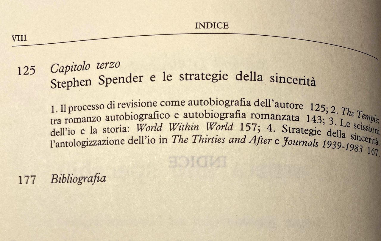 Capitolo terzo. Stephen Spender e le strategie della sincerità. Il processo di revisione come autobiografia dell'autore. The Temple: tra romanzo autobiografico e autobiografia romanzata. Le scissioni dell'io e la storia: World Within World. Strategie della sincerità: l'antologizzazione dell'io in The Thirties and After e Journals 1939-1983.