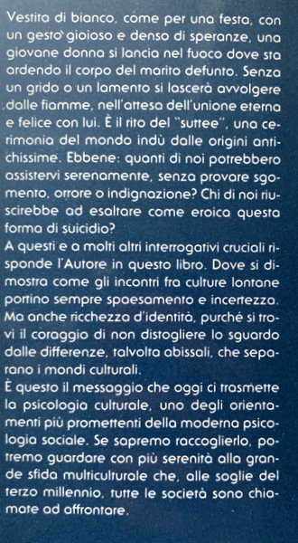 Vestita di bianco, come per una festa, con un gesto gioioso e denso di speranze, una giovane donna si lancia nel fuoco dove sta ardendo il corpo del marito defunto. Senza un grido o un lamento si lascerà avvolgere dalle fiamme, nell'attesa dell'unione eterna e felice con lui. È il rito del "suttee", una cerimonia del mondo indù dalle origini antichissime. Ebbene: quanti di noi potrebbero assistervi serenamente, senza provare sgomento, orrore o indignazione? Chi di noi riuscirebbe ad esaltare come eroica questa forma di suicidio? A questi e a molti altri interrogativi cruciali risponde l'Autore in questo libro. Dove si dimostra come gli incontri fra culture lontane portino sempre spaesamento e incertezza. Ma anche ricchezza d'identità, purché si trovi il coraggio di non distogliere lo sguardo dalle differenze, talvolta abissali, che separano i mondi culturali. È questo il messaggio che oggi ci trasmette la psicologia culturale, uno degli orientamenti più promettenti della moderna psicologia sociale. Se sapremo raccoglierlo, potremo guardare con più serenità alla grande sfida multiculturale che tutte le società, all'inizio di questo terzo millennio, sono chiamate ad affrontare.