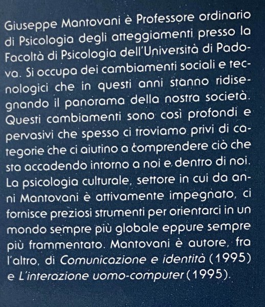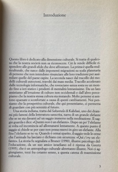 Soggetti: Psicologia sociale, Studi culturali e sociali, Incontri culturali, Mediazione interculturale, Sociologia, Antropologia, Filosofia, Politica, Società, Studi interdisciplinari, Bruner, Geerz, Elefante, Sakuntala, Kalidasi, Pluralismo, Interculturalismo, Inclusione, Esclusione, Integrazione, Altre culture, Riti, Rituali, Religioni, Miti, Credenze, Cultura popolare, Tradizioni, Valori, Altro, Alterità, Scienze sociali, Sociologia, Razzismo, Diversità, Accoglienza, Riconoscimento, Diritti umani, Vygotskij, Simbolismo, Differenze culturali, Differenziazione, Assimilazione, Esperienza, Conoscenza, Stereotipi, Pregiudizio, Norme sociali, Influenze, Radici culturali, Oriente, Occidente, Indigeni, Nativi americani, Conquistatori, Cristoforo Colombo, Eccidi di massa, Olocausto, Shoah, Antisemitismo, Genocidio, Slums, Ghetti, Separazione, Lingue, Ghettizzazione, Pulizia etnica, Autodeterminazione, Attualità, Emancipazione, Apartheid, Sud Africa, Schiavitù, Schiavismo, Negri, Neri, Afroamericani, Indie, Borges, Animali, Spiritualità, Riferimento, Bibliografia, Letteratura, Libri Vintage Fuori catalogo, Educazione, Eredità, Rivendicazioni, Minoranze etniche, Maori, Potter, Wheterhell, Extracomunitari, Stranieri, Ospitalità, Paolo Calegari, Bruno Mazzara, Van Dijk, Regole, Mediazione, Glucksberg, Keysar, Greenblatt, Comunicazione, Gruppi, Comunità, Individuo, Comportamento, Social psychology, Cultural studies, Cultural encounters, Intercultural mediation, Sociology, Anthropology, Philosophy, Politics, Society, Interdisciplinary studies, Elephant, Pluralism, Interculturalism, Inclusion, Exclusion, Integration, Other cultures, Rites, Rituals, Religions, Myths, Beliefs, Popular culture, Traditions, Values, Others, Otherness, Social sciences, Sociology, Racism, Diversity, Reception, Recognition, Human rights, Symbolism, Cultural differences, Differentiation, Assimilation, Experience, Knowledge, Stereotypes, Prejudice, Social norms, Influences, Cultural roots, East, West, Indigenous, Native Americans, Conquerors, Christopher Columbus, Mass killings, Holocaust, Anti-Semitism, Genocide, Slums, Ghettos, Separation, Languages, Ghettoization, Ethnic cleansing, Self-determination, Current affairs, Emancipation, Apartheid, South africa, Slavery, Negroes, Blacks, African americans, Indies, Animals, Spirituality, Reference, Bibliography, Literature, Out of print books, Education, Inheritance, Claims, Ethnic minorities, Maori, Non-EU citizens, Foreigners, Hospitality, Rules, Mediation, Communication, Groups, Community, Individual, Behavior