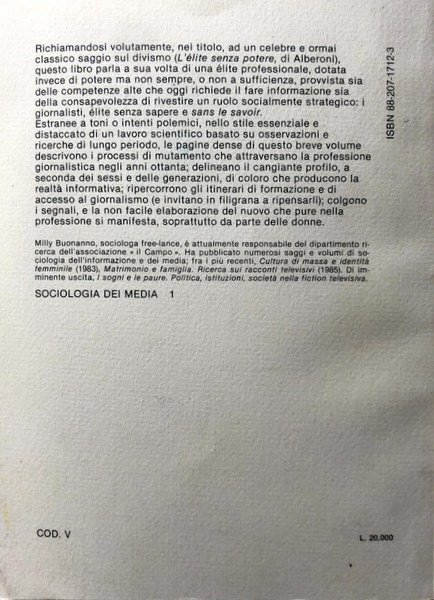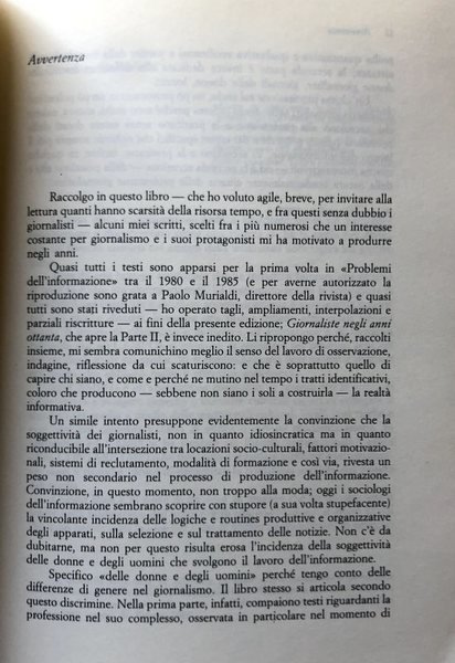 Soggetti: Scienze sociali, Studi sulla comunicazione, Media, Editoria, Stampa periodica, Giornalismo, Economia, Finanza, Management, Diritto, Lavoro, Professioni, Mestieri, Giornalisti italiani, Pubblicisti, Norme, Leggi, Etica professionale, Carriera giornalistica, Formazione, Reclutamento, Direttori, Alberoni, Notizie, Donne, Uomini, Profilo sociale, Requisiti, Confronti internazionali, Dati d'opinione, Modello Francese, Femminismo, Anni Settanta, Cultura, Anni Ottanta, Giornaliste, Roma, Generazioni, Differenze di genere, Televisione, Giornali, Quotidiani, Riviste, Editoriali, Elzeviri, Gossip, Costume, Studi di Settore, Industria, Politica, Società, Paolo Murialdi, Informazione, Lettori, Lettura, Consumatori, Vendite, Quotidiano Donna, Attenzione, Statistiche occupazionali, Libri Vintage, Fuori catalogo, Social sciences, Communication studies, Media, Publishing, Periodical press, Journalism, Economics, Finance, Management, Law, Work, Professions, Professions, Italian journalists, Publicists, Rules, Laws, Professional ethics, Journalism career, Training, Recruitment, Directors, News, Women, Men, Statistics, Social profile, Requirements, International comparisons, Opinion data, French model, Feminism, Seventies, Culture, Eighties, Journalists, Rome, Generations, Gender differences, Magazines, Editorials, Custom, Sector Studies, Industry, Politics, Society, Information, Readers, Reading, Consumers, Sales, Female Newspaper, Attention, Employment Statistics, Out of print Books